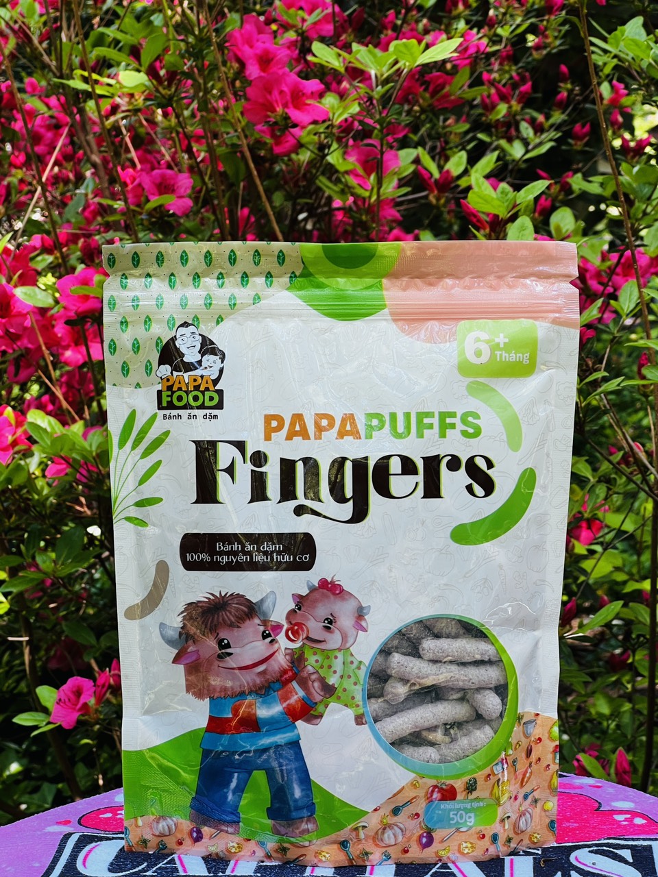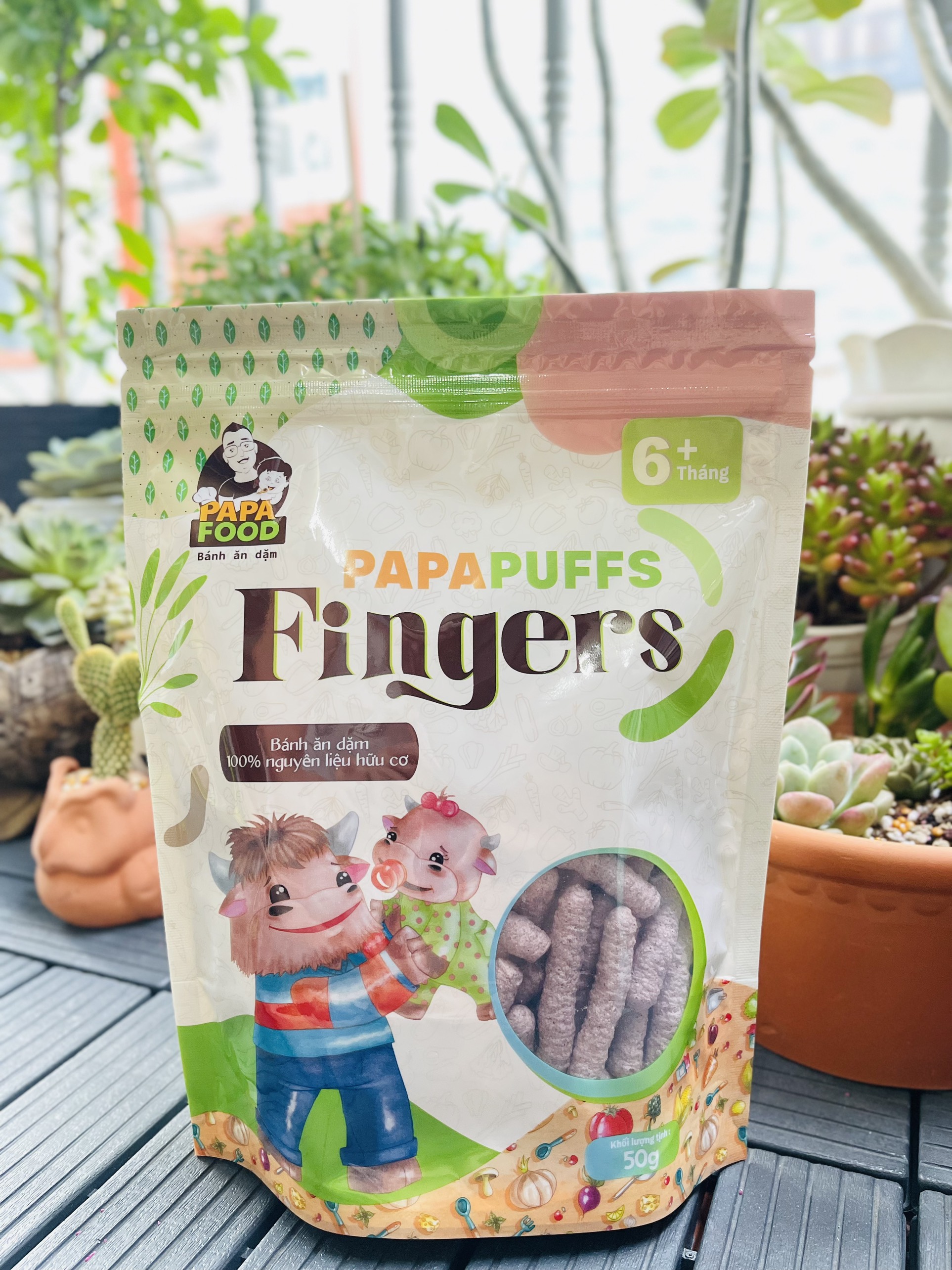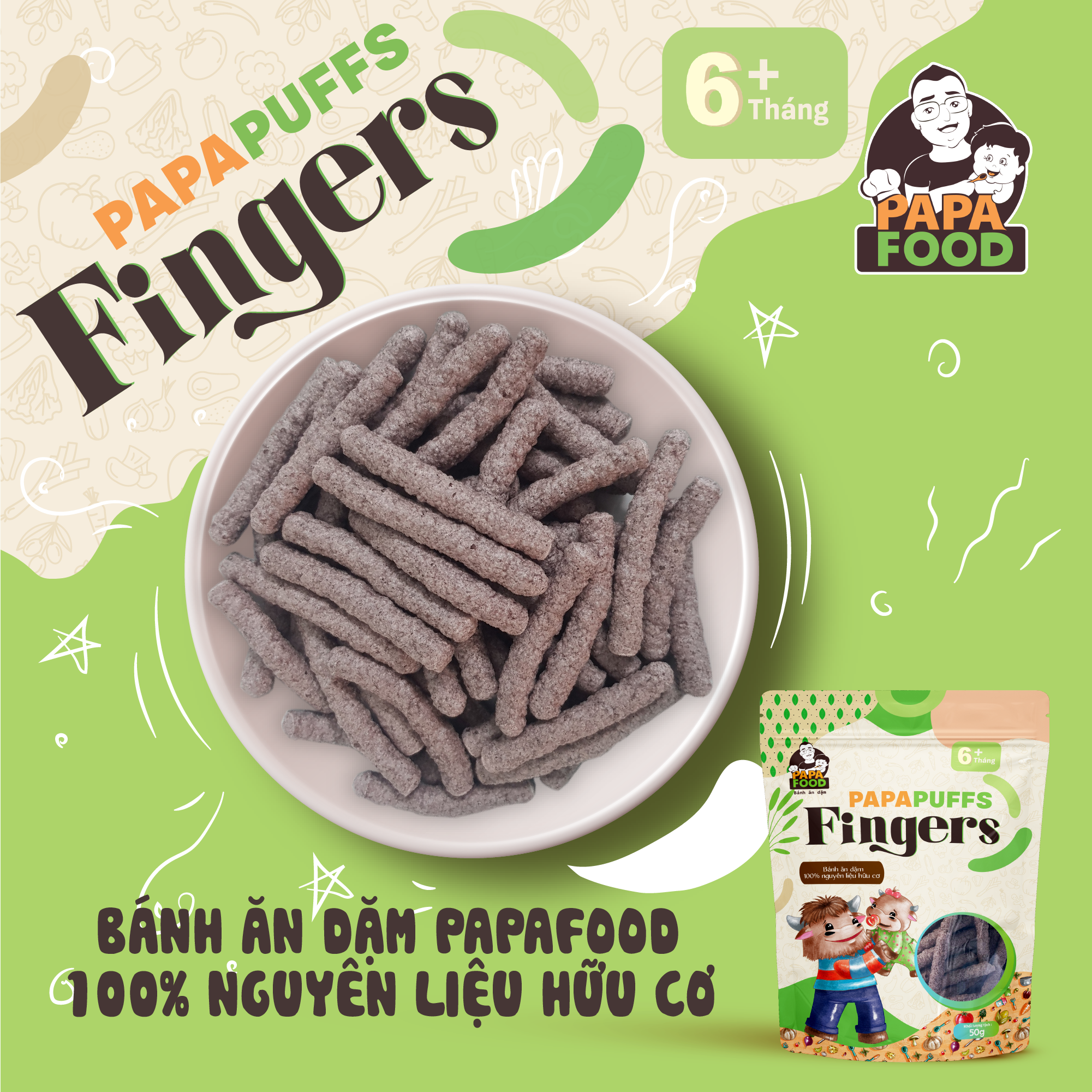 1. Tên sản phẩm: Bánh ăn dặm PAPAPUFFS FINGERS - 100% Nguyên Liệu Hữu cơ 2. Thành phần: Sản phẩm được sản xuất từ 100% Nguyên Liệu Hữu Cơ gồm gạo đen hữu cơ 97%,