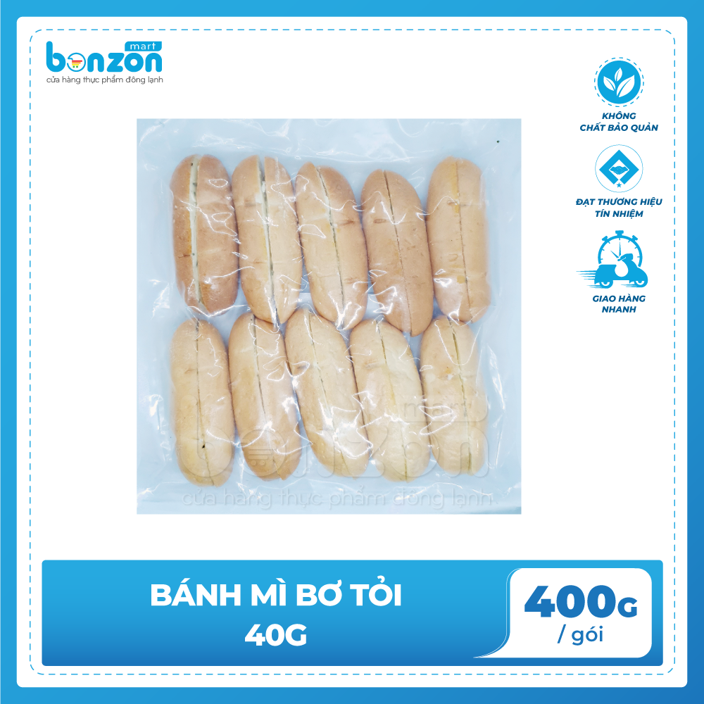 Với sản phẩm tươi sống, trọng lượng thực tế có thể chênh lệch khoảng 10%. ĐỊNH LƯỢNG: 400g/gói (10 cái) THÀNH PHẦN: Bánh mì, bơ lạt, tỏi, gia vị MÔ TẢ SẢN PHẨM: Có thể ăn