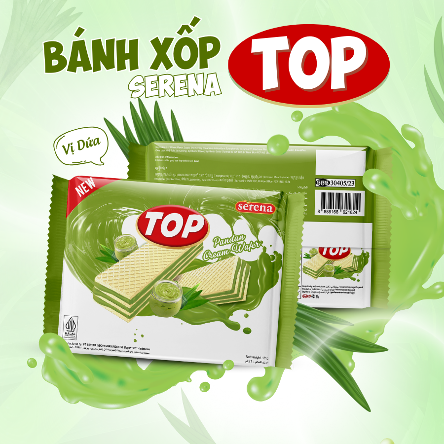 Bạn yêu thích bánh xốp kem thơm ngon, giòn rụm? Hãy thử ngay Bánh xốp kem Serena TOP 21g – sự kết hợp hoàn hảo giữa lớp bánh xốp giòn tan và nhân kem sánh