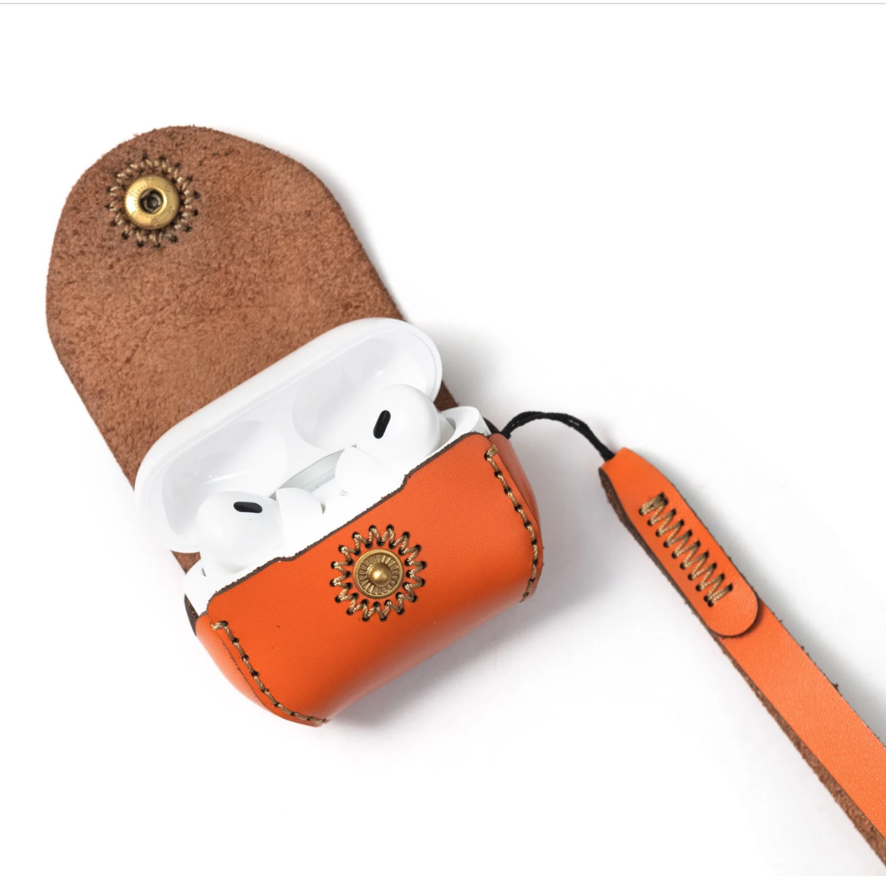 Sản phẩm gồm bao da Apple Airpods Pro 3 và dây đeo tay. Thiết kế tối giản với đường cắt góc botròn mềm mại ôm sát sản phẩm. Lớp da bò thô bên trong giúp