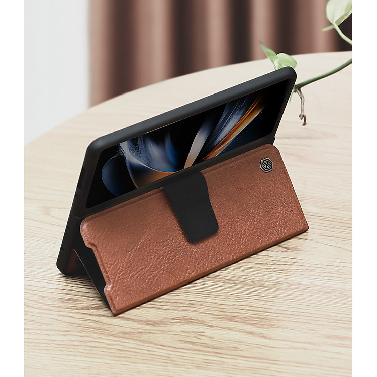 Ốp lưng chống sốc trang bị ngăn đựng S-Pen cho Samsung Galaxy Z Fold 5 hiệu Nillkin Aoge Leather Cover Case có khả năng sử dụng như một giá đỡ điện thoải để bàn rất tiện lợi cho các hoạt động xem phim, học tập, giải trí,