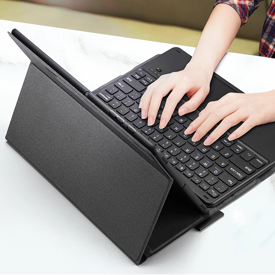 Bao da kèm bàn phím chính hãng Dux Ducis có bàn di chuột TrackPad với chân đế có thể điều chỉnh, bàn phím có thể tháo rời và bàn di chuột thông minh để đánh máy, xem, đọc và vẽ, cho phép bạn tận hưởng trải nghiệm điều khiển linh hoạt hơn.