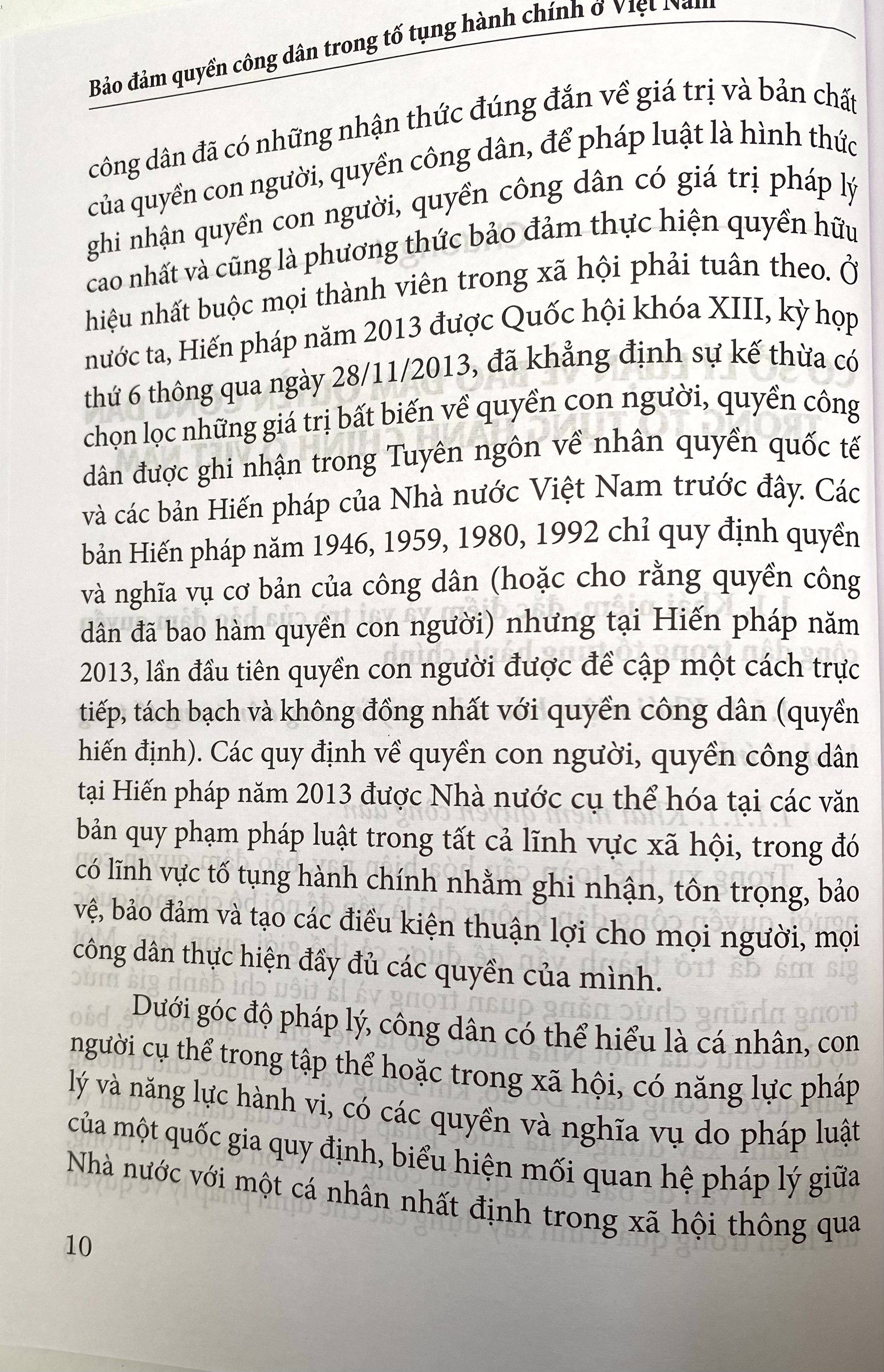 Bảo đảm quyền con người, quyền công dân là một trong những vấn đề quan trọng được hầu hết các quốc gia trên thế giới quan tâm. Bảo đảm quyền công dân chính là bảo đảm nền dân chủ, bảo đảm hiệu lực, hiệu quả hoạt động của Nhà nước cũng như quyền và lợi ích hợp pháp của công dân. Đảng và Nhà nước ta luôn nhất quán đường lối, chính sách tôn trọng và bảo đảm quyền con người, quyền công dân, lấy con người là mục tiêu và động lực của sự phát triển. Điều 14 Hiến pháp năm 2013 đã khẳng định: " ' các quyền con người, quyền công dân về chính trị, dân sự, kinh tế, văn hóa, xã hội được công nhận, tôn trọng, bảo vệ, bảo đảm theo Hiến pháp và pháp luật". Quy định này đã thể hiện trách nhiệm của Nhà nước trong việc bảo đảm quyền con người, quyền công dân được thực hiện trên thực tế, là sự bảo đảm tính cân bằng trong mối quan hệ giữa Nhà nước và công dân trên các lĩnh vực, trong đó có lĩnh vực tố tụng hành chính.