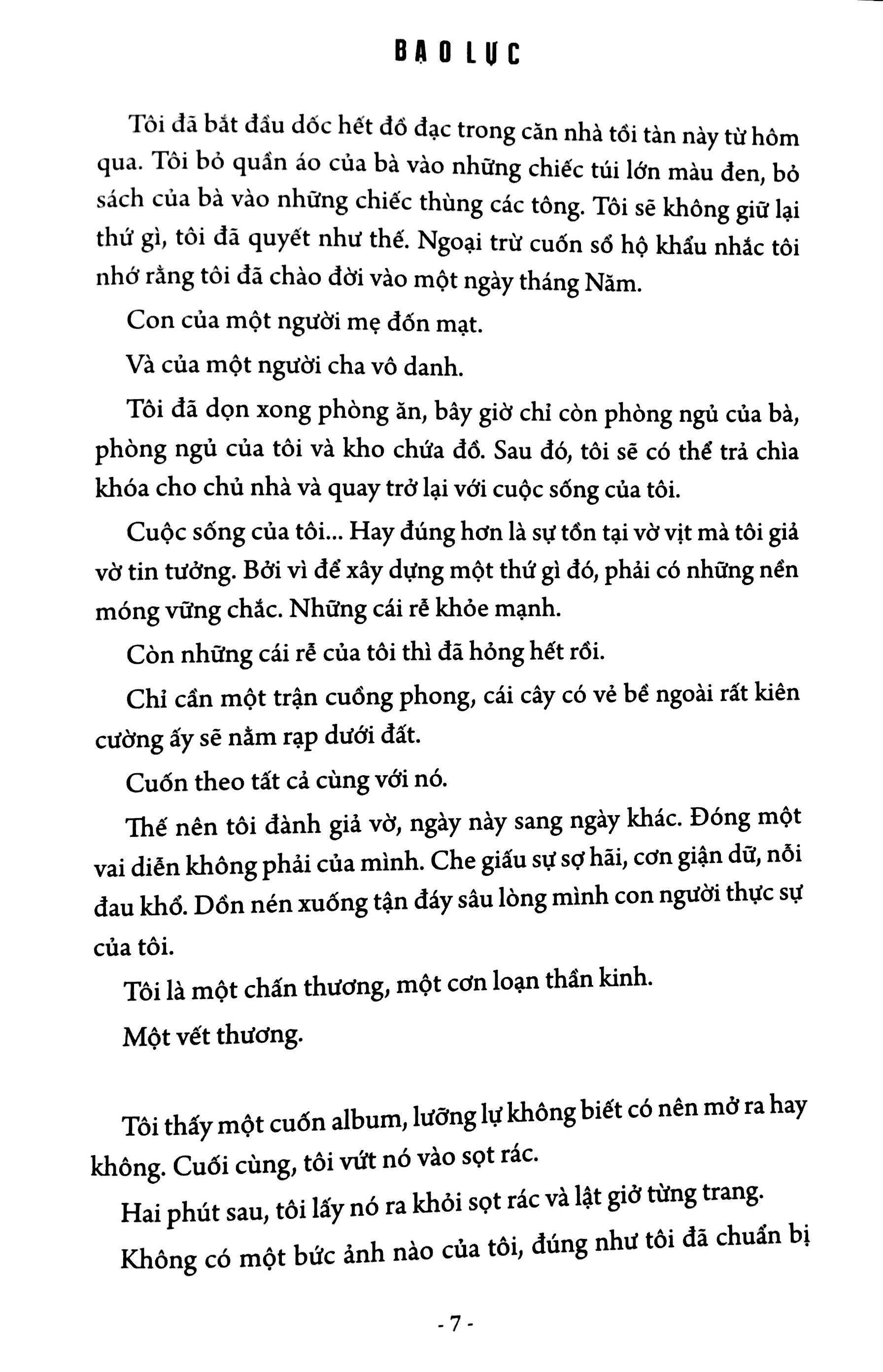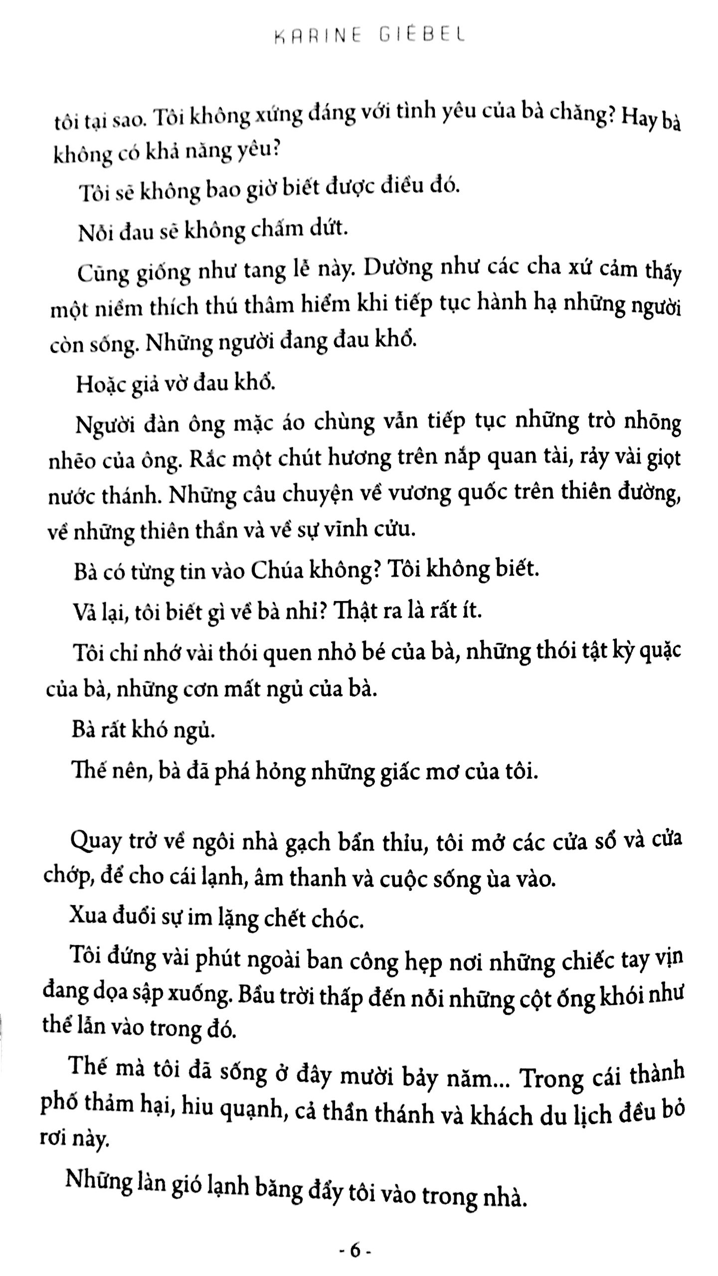 Tôi đã bắt đầu dốc hết đồ đạc trong căn nhà tồi tàn này từ hôm qua. Tôi bỏ quần áo của bà vào những chiếc túi lớn màu đen, bỏ sách của bà vào những chiếc thùng các tông. Tôi sẽ không giữ lại thứ gì, tôi đã quyết như thế. Ngoại trừ cuốn sổ hộ khẩu nhắc tôi nhớ rằng tôi đã chào đời vào một ngày tháng Năm.