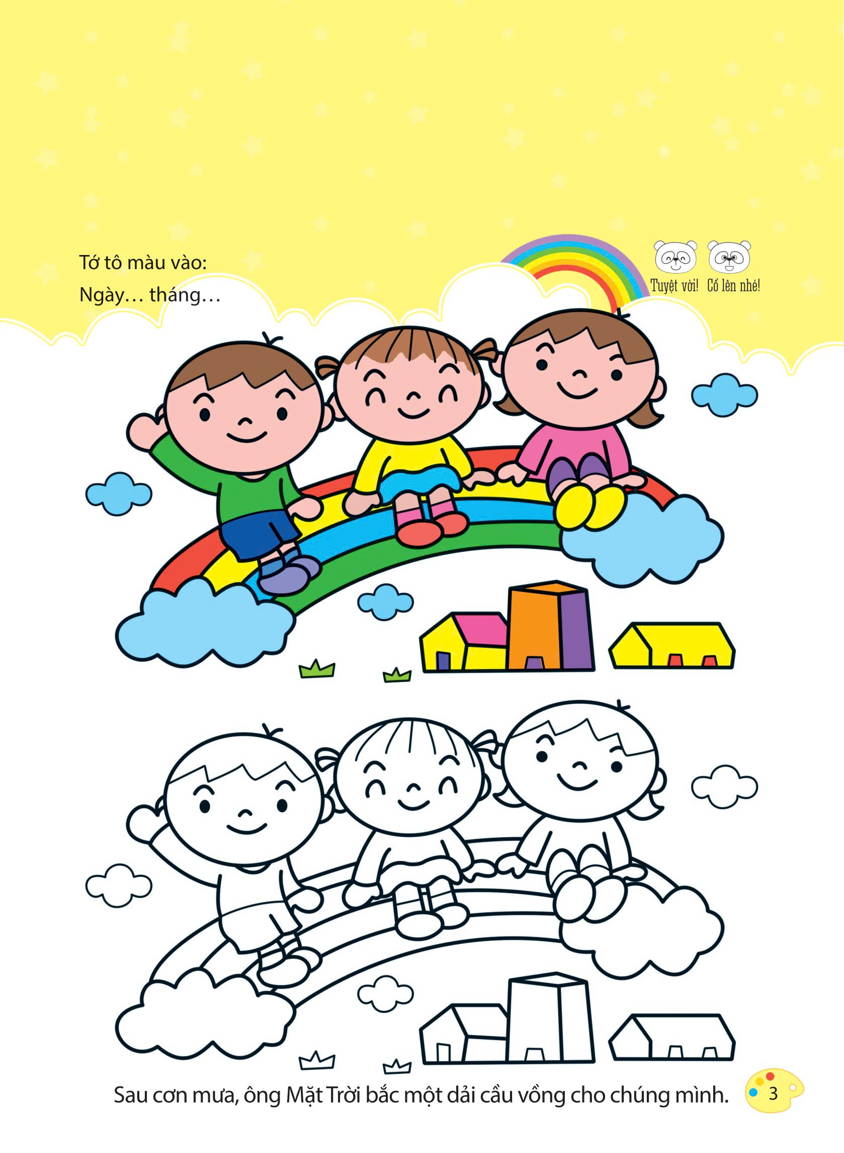 Ngoài việc tô màu theo sự sáng tạo riêng của mỗi bé, sách có gợi ý màu sắc, hình tô mẫu để các bé có thể dễ tưởng tượng và ghi nhớ được hình dạng và màu sắc.