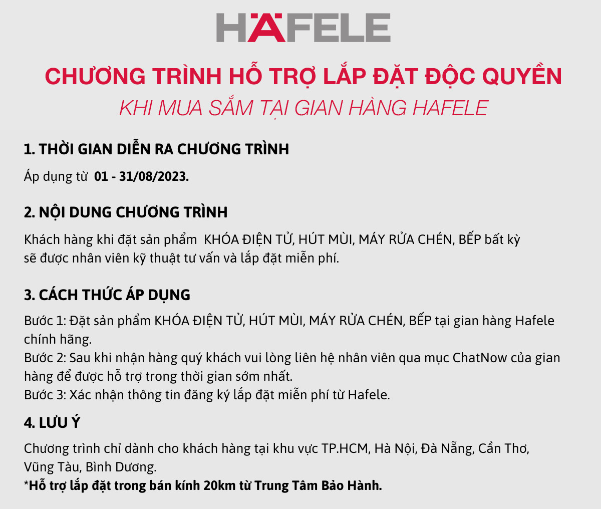 Note: Chương trình chỉ dành cho khách hàng tại khu vực TPHCM, Hà Nội, Đà Nẵng, Cần Thơ, Vũng Tàu, Bình Dương. Hỗ trợ tận nơi trong bán kính 20km (tính từ trạm bảo hành HAFELE đến địa chỉ lắp đặt của khách hàng). Xem danh sách trạm bảo hành tại Website của Hafele.