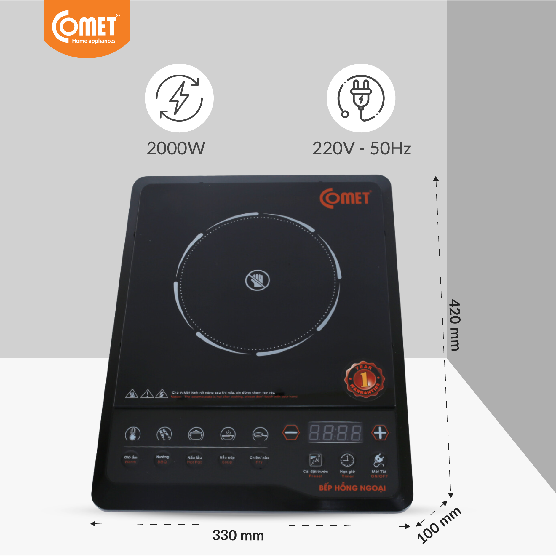THÔNG TIN KỸ THUẬT: 1.Thương hiệu : Comet 2.Sản phẩm : Bếp hồng ngoại 3.Mã sản phẩm : CM5517 4.Điện áp : 220V - 50Hz 5.Công suất: 2000W 6.Kích thước : 330*100*420 mm – cân