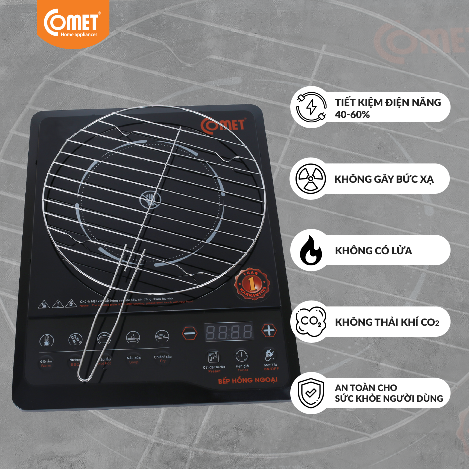 ƯU ĐIỂM NỔI BẬT - Bếp hồng ngoại Comet CM5558 có thiết kế và màu sắc ưa nhìn, nhiều chức năng nấu tiện lợi và tiết kiệm điện năng. - Mặt bếp trang bị kính
