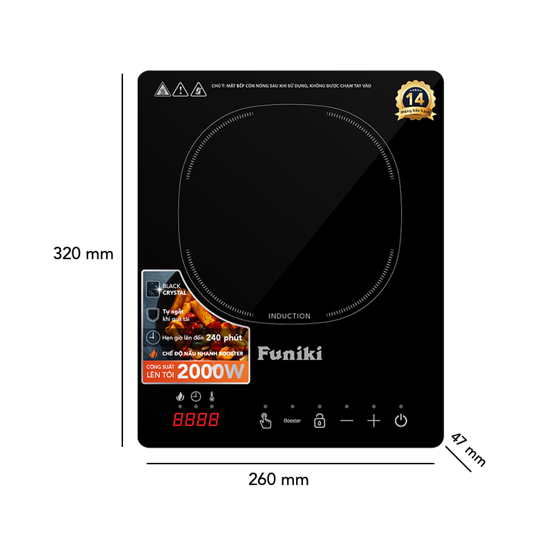 Mặt kính ceramic chịu nhiệt Mâm từ đường kính 22cm Mâm từ tự động nhận biết kích cỡ xoong nồi. Chức năng hẹn giời, chế độ xào rá Điều khiển công suất / nhiệt độ