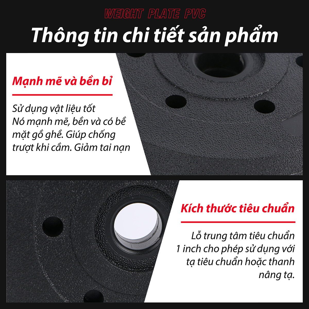 - Trên mỗi miếng tạ có ghi rõ trọng lượng tạ, giúp người tập không bị nhầm lẫn khi chọn tạ để tập. Công dụng sản phẩm: