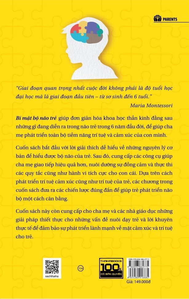 BÍ MẬT BỘ NÃO TRẺ - Álvaro Bilbao - Song Hạo dịch (bìa mềm) - Giá bìa: 149.000đ Sự thật là chúng ta biết rất nhiều điều về bộ não và những điều đó có thể giúp ích cho cha mẹ, nhưng đáng tiếc là họ lại không hề hay biết. Tác giả muốn giúp bạn hiểu cách thức bạn có thể tác động tích cực đến sự phát triển bộ não của con. Hàng trăm nghiên cứu chỉ ra rằng bộ não có khả năng linh hoạt rất lớn và những bậc cha mẹ áp dụng các chiến lược đúng đắn có thể giúp con mình phát triển não bộ một cách cân bằng. Đây là lý do tại sao tôi tập hợp các nguyên lý cơ bản, công cụ và kỹ thuật giúp bạn trở thành người có ảnh hưởng nhất tới sự phát triển trí tuệ và cảm xúc của con. Với những nguyên lý, công cụ và kỹ thuật này, bạn sẽ không chỉ giúp trẻ phát triển tốt các kỹ năng trí tuệ và cảm xúc mà còn góp phần ngăn ngừa những khó khăn trong quá trình phát triển của trẻ, chẳng hạn như thiếu tập trung, trầm cảm hoặc các vấn đề về hành vi. Khẳng định rằng kiến thức cơ bản về cách bộ não của trẻ phát triển và tự vận hành sẽ giúp ích rất nhiều cho những bậc cha mẹ muốn tận dụng chúng. Tin rằng những kiến thức, chiến lược và kinh nghiệm mà bạn tìm thấy dưới đây sẽ góp phần biến công việc làm cha mẹ của bạn thành một trải nghiệm vô cùng thỏa mãn. Bí mật bộ não trẻ giúp đơn giản hóa khoa học thần kinh đằng sau những gì đang diễn ra trong não trẻ trong 6 năm đầu đời, giúp cha mẹ phát triển toàn bộ tiềm năng trí tuệ và cảm xúc của con mình. Cuốn sách bắt đầu với lời giải thích dễ hiểu về những nguyên lý cơ bản để hiểu được bộ não của trẻ. Sau đó, cung cấp các công cụ giúp cha mẹ giao tiếp hiệu quả hơn, nuôi dưỡng sự đồng cảm và thực thi các quy tắc cũng như hành vi tích cực cho con cái. Dựa trên cách phát triển trí tuệ cảm xúc cũng như trí tuệ của trẻ, các chương trong cuốn sách đưa ra các chiến lược đúng đắn có thể giúp trẻ phát triển não bộ một cách cân bằng. Cuốn sách dành cho những nhà giáo dục, các thầy cô giáo, nhà tâm lý học gia đình và người quan tâm và nghiên cứu về giáo dục trẻ em và dành cho các bậc cha mẹ quan tâm tới hành vi, tâm lý và sự phát triển lành mạnh của con cái Cuốn sách này còn cung cấp cho cha mẹ và các nhà giáo dục những giải pháp thiết thực cho những vấn đề nuôi dạy trẻ và lời khuyên thực tế để đảm bảo sự phát triển lành mạnh về mặt cảm xúc và trí tuệ cho trẻ.  MỤC LỤC: Lời cảm ơn Lời giới thiệu PHẦN I: CÁC NGUYÊN LÝ CƠ BẢN