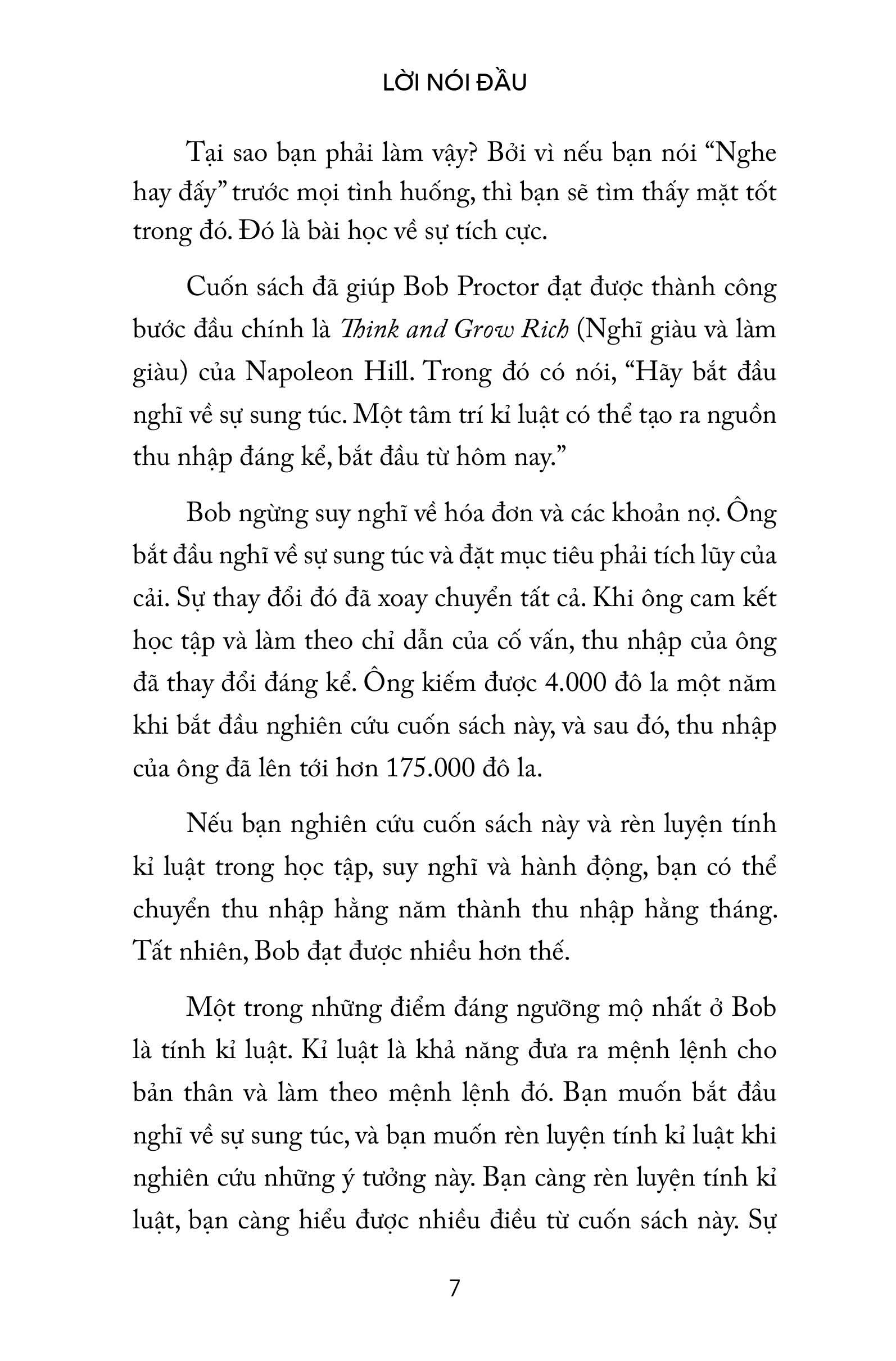 Một trong những điểm đáng ngưỡng mộ nhất ở tác giả của cuốn sách này là tính kỉ luật. Kỉ luật là khả năng đưa ra mệnh lệnh cho bản thân và làm theo mệnh lệnh đó. Bạn muốn bắt đầu nghĩ về sự sung túc, và bạn muốn rèn luyện tính kỉ luật khi nghiên cứu những ý tưởng này. Bạn càng rèn luyện tính kỉ luật, bạn càng hiểu được nhiều điều từ cuốn sách này. Sự sung túc chính là như thế. Sự thịnh vượng chính là như thế. Sự viên mãn trong cuộc sống chính là như thế.