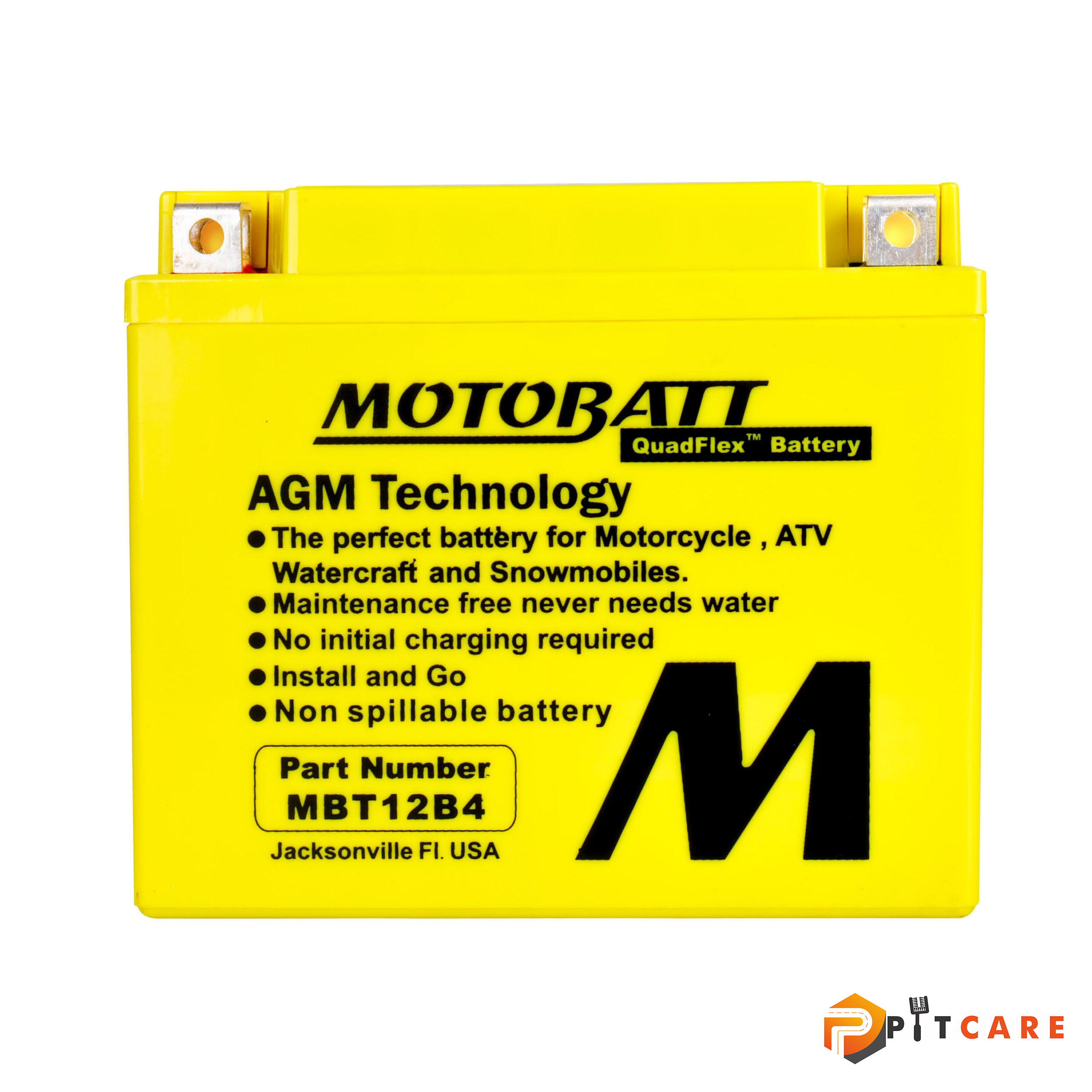 Bình ắc quy Quadflex Motobatt MBT12B4 Chi tiết: - 12V - 14Ah - CCA150 - Kích Thước 150x70x130 mm - Khối lượng: 3.5kg - Bảo Hành 6 tháng Phù hợp cho nhiều dòng PKL của