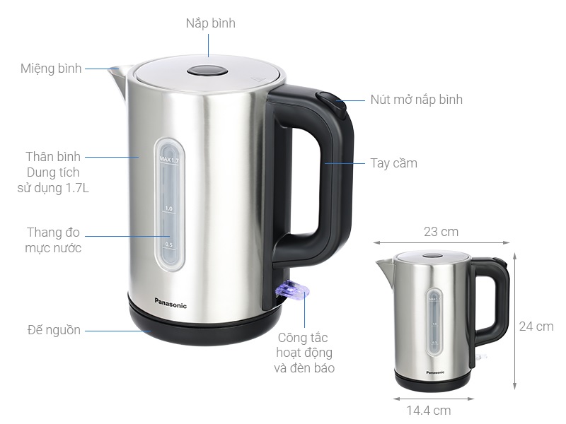 Thông số kỹ thuật - Công suất: 1850 - 2200W - Dung tích: 1.7 lít - Chất liệu ruột bình: Thép không gỉ - Chất liệu vỏ bình: Thép không gỉ - Đế tiếp điện: Hãng không công bố - Thương hiệu của: Nhật Bản Kích thước và trọng lượng Chiều cao239mmChiều rộng241mmChiều sâu144mmTrọng lượng1.12kg Tính năng Thiết kế bằng thép không gỉ sang trọng và bền bỉ với thời gian Toàn bộ thân bình cùng nắp làm bằng bằng thép không gỉ với các mép bo tròn tạo nên một tổng thể thiết kế sang trọng và hiện đại. Dây nguồn quấn quanh đế, mang đến sự gọn gàng, phù hợp với mọi không gian bếp. Đèn LED báo nước sôi Đèn LED phát sáng khi bình đang đun nước và tắt khi bình đã đun xong, giúp theo dõi quá trình đun nước dễ dàng. Dễ dàng vệ sinh Nắp bình có đường lính lớn 118mm giúp bạn dễ dàng vệ sinh và làm sạch tới đáy bình. Bộ lọc chống đóng cặn có thể tháo rời, giúp lọc nước sạch sẽ, tinh khiết, không lẫn tạp chất Màng lọc trên vòi có tác dụng lọc và ngăn cặn bẩn thoát ra cùng với nước, cho bạn sự yên tâm khi thưởng thức đồ uống mỗi ngày. Mở nắp dễ dàng không lo bỏng tay! Sử dụng nút gạt trên tay cầm để mở nắp, hạn chế tiếp xúc với ấm còn nóng sau khi đun nước Vạch báo theo dõi nước tiện lợi