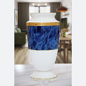 Bình hoa tạo nét sang trọng với đường họa tiết mạ vàng tại vị trí cổ bình hoa bóp lại tạo điểm nhấn kiểu dáng và hoa văn. Nửa trên thân bình hoa nổi bật với lớp màu xanh da trời họa tiết vân đá, nửa dưới đối lập cân xứng với màu trắng sứ, xen giữa 2 màu xanh và trắng là đường chỉ vàng giữa thân bình