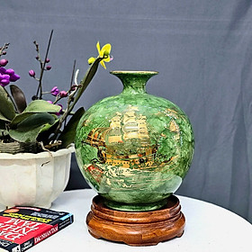 Bình hút tài lộc men màu xanh lục đắp nổi Thuận Buồm Xuôi Gió kênh vẽ vàng 24k, cao 28cm