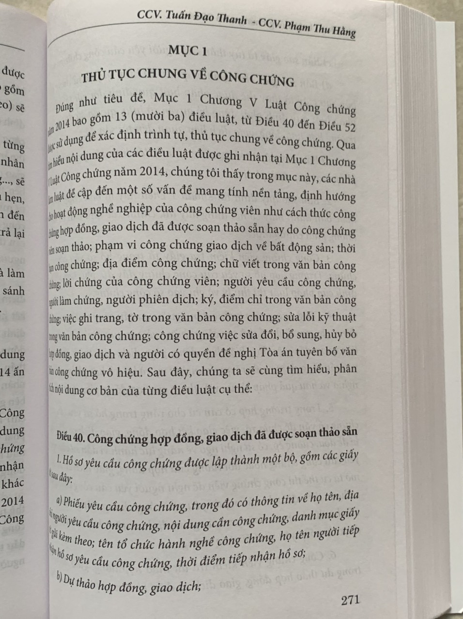 Trong mỗi chương các tác giả đều trình bày nhận xét tổng quan, tiếp đó phân tích, bình luận từng điều luật dựa trên kinh nghiệm hành nghề thực tế của bản thân xuất phát từ yêu cầu, đòi hỏi khách quan của cuộc sống và được so sánh với nội dung những văn bản quy phạm pháp luật điều chỉnh một số lĩnh vực có liên quan mật thiết đến hoạt động công chứng, đồng thời đề cập một số quan điểm còn có thể có ý kiến đa chiều để bạn đọc tiếp cận. Dù các tác giả đã dành sự tâm huyết và cố gắng trong quá trình biên soạn nhưng cuốn sách khó tránh khỏi những hạn chế, thiếu sót nhất định. Các tác giả và Nhà xuất bản rất mong nhận được ý kiến đóng góp của bạn đọc.