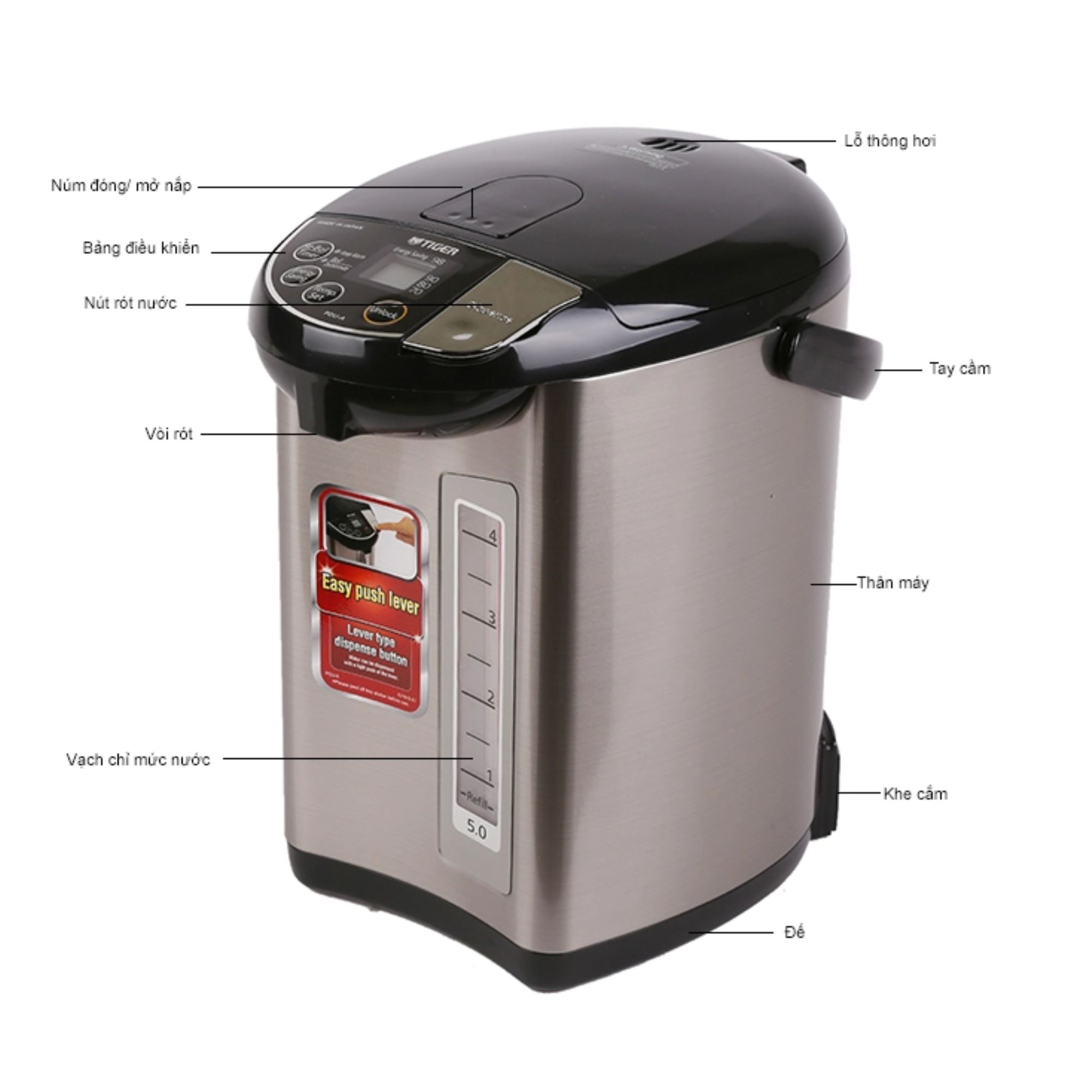 - Đặc điểm nổi bật: Chức năng đun sôi nước Chức năng giữ ấm nước với 4 mức nhiệt độ : 70, 80, 90, 98 độ C Chức năng tái đun sôi khi nước nguội Chức năng khử mùi mùi Clo cho nước thêm tinh khiết hơn. Bình thủy điện còn được tích hợp các chức năng an toàn như : chức năng tự động tắt khi nước cạn, chức năng tự động ngắt khi quá nhiệt quá áp, chức năng khóa vòi an toàn, đảm bảo cho quá trình sử dụng bình thủy điện của người dùng được diễn ra suôn sẽ và an toàn nhất. Bình thủy điện Tiger PDU-A40W còn được tích hợp thang báo mực nước còn lại trong bình giúp người dùng dễ kiểm soát được lượng nước và thêm nước khi cần thiết. Ngoài các chức năng chính là đun sôi và giử ấm, bình còn tích hợp thêm chức năng tiết kiệm điện và chức năng hẹn giờ đun sôi lại. Bình thủy điện Tiger PDU-A40W có công suất 928W, dung tích lồng bình 4 lít đáp ứng cho nhu cầu nấu nước và cung cấp nước nóng cho gia đình bạn, phục các nhu cầu cuốc sốn hằng ngày.