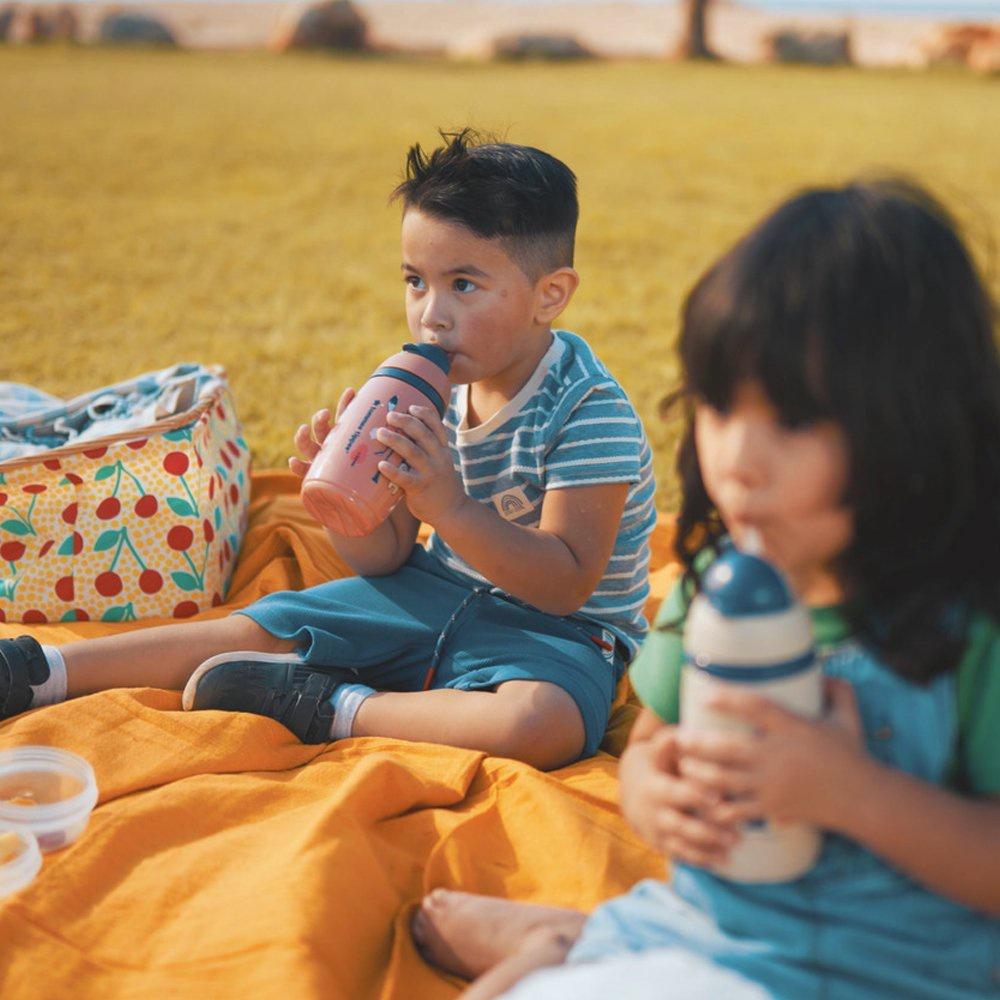 - Cách nhiệt hai lớp: Thân bình cách nhiệt ngăn ngừa sự ngưng tụ hơi nước bên ngoài bề mặt bình và giữ mát cho nước trong thời gian dài, khuyến khích bé uống đủ nước và giữ cho bé mát mẻ trong khi chơi.