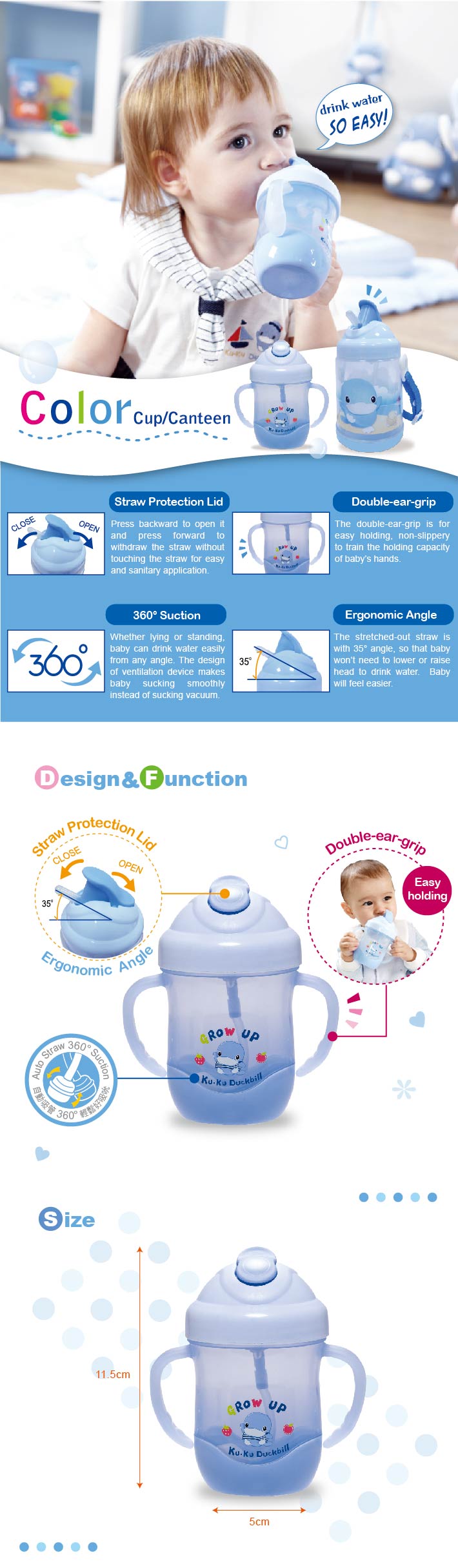 - Dung tích 260ml; - Sự lựa chọn hoàn hảo cho bước chuyển từ bình sữa sang bình nước Bé trên 6 tháng đang trong giai đoạn phát triển răng miệng, bình nước Kuku ngoài