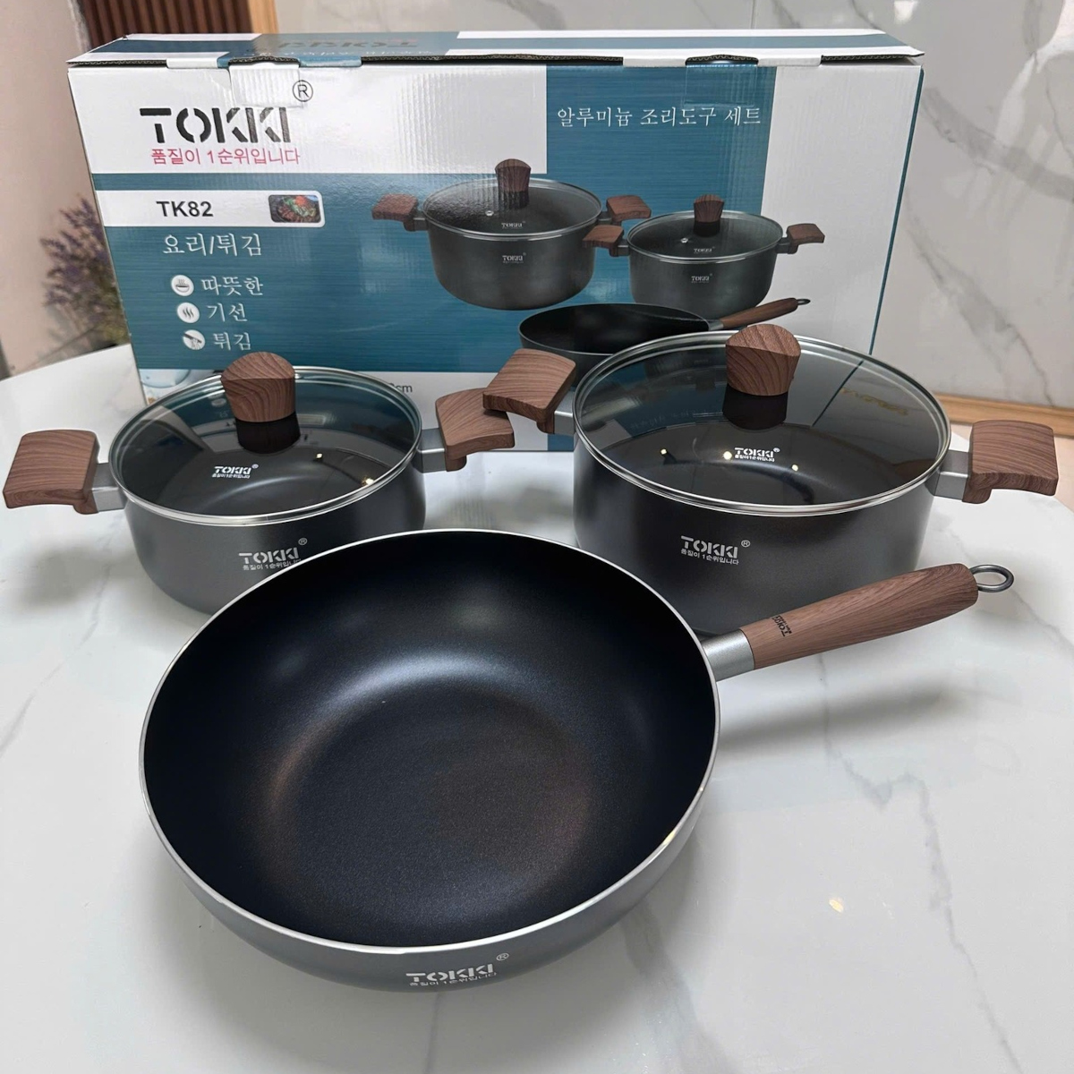 ✨Bộ 2 nồi 1 chảo nhôm chống dính 5 lớp Tokki Hàn Quốc TK82 đáy từ gồm nồi 20cm, 24cm và chảo 28cm