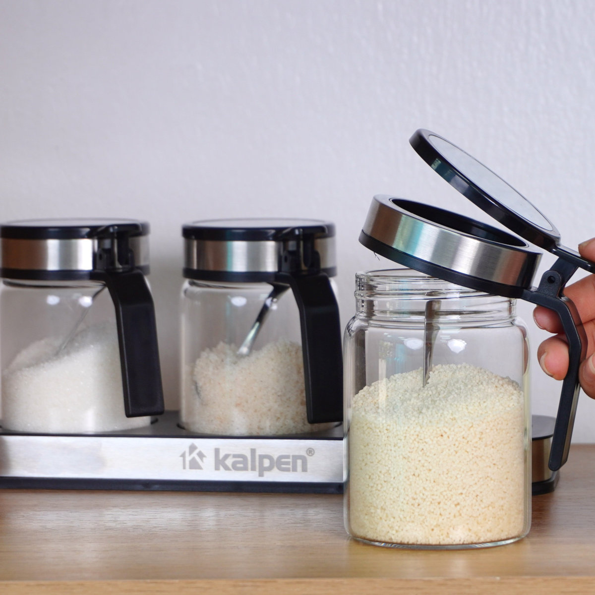 Bộ 3 hũ thủy tinh đựng gia vị 300ml Kalpen SB2 kèm khay và muỗng Inox