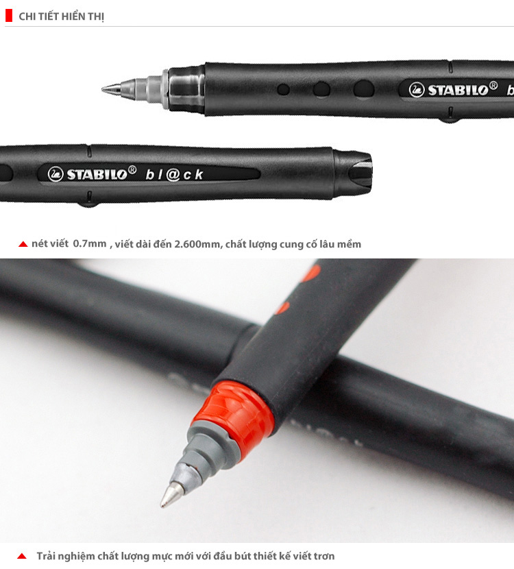 - Đầu bi: 0.8 mm dạng Cone , sản xuất tại Thụy Sĩ. - Độ dài viết được: 1.200-1.500m. - Thân bút thanh mảnh cơ chế bấm khế tiện dụng phù hợp cho mọi người.