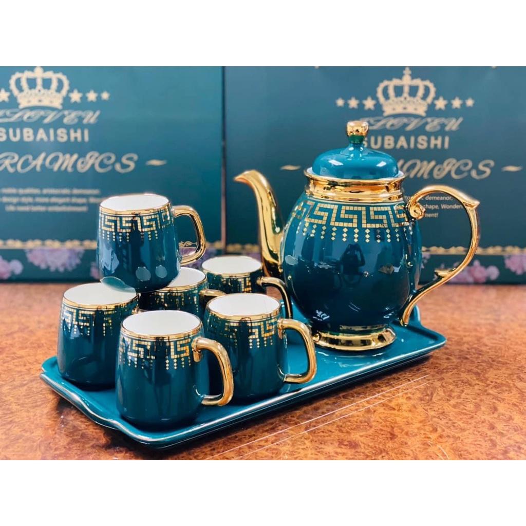 ✨BỘ ẤM CHÉN KÈM KHAY SỨ CAO CẤP PHA TRÀ CÀ PHÊ XANH HỌA TIẾT MẮT XÍCH