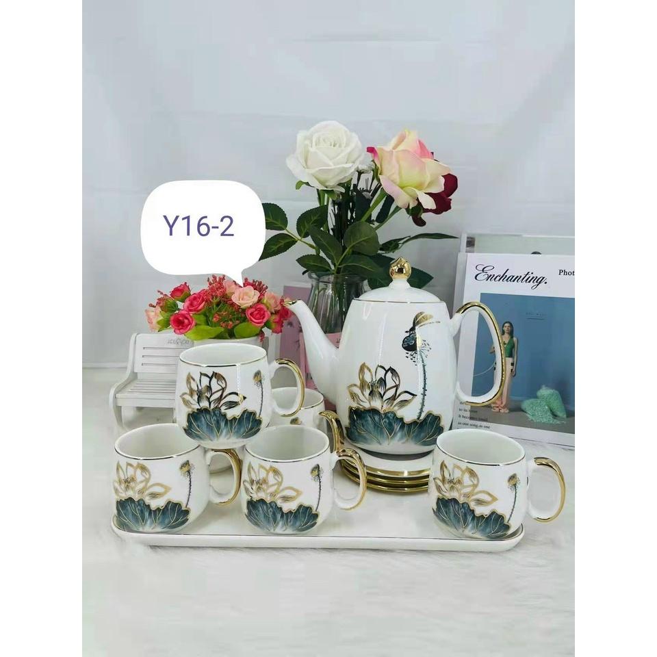 ✨BỘ ẤM CHÉN KÈM KHAY SỨ PHA TRÀ CÀ PHÊ CAO CẤP TRẮNG HỌA TIẾT HOA SEN