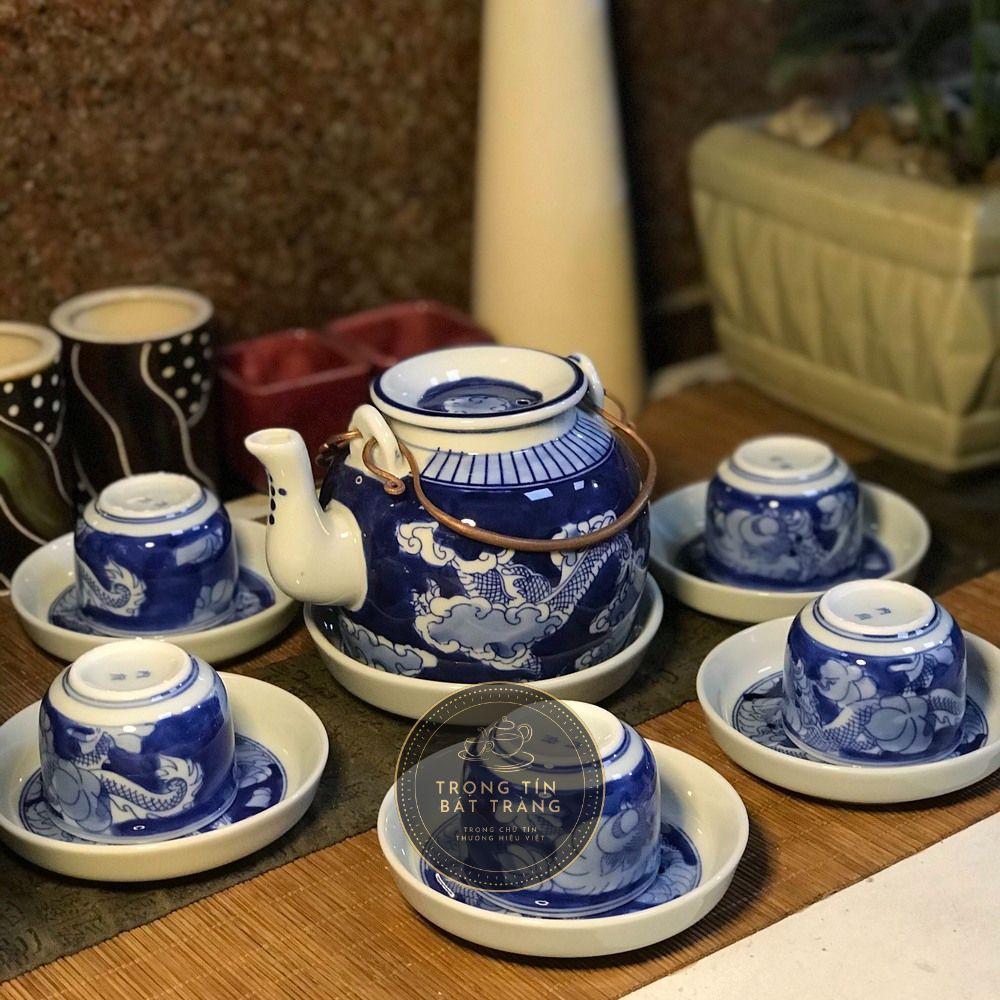 ATA 22 Bộ Ấm Chén Gốm Sứ Men Lam Bát Tràng Họa Tiết Long Ẩn Dáng Đại Bân Đề Lương Dung Tích 480ml