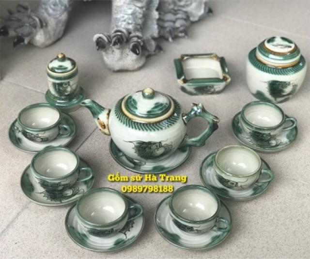 Bộ ấm chén Bát Tràng phú quý men xanh lục ngọc bảo họa tiết Phúc - Lộc - Thọ vẽ vàng 24k - Là sản phẩm hội tụ được nét tinh xảo của bàn tay