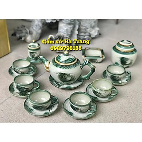 Bộ ấm chén Phúc Lộc Thọ dáng chóp men lục bảo vẽ vàng Gốm sứ Bát Tràng cao cấp Dung tích 430ml 1 ấm 6 chén 7 đĩa kê giá 650k