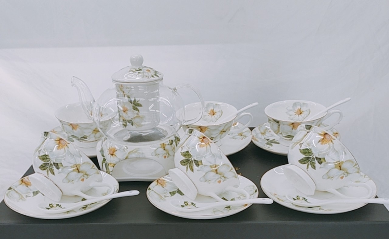 *Bộ ấm trà cà phê cao cấp được làm từ sứ xương với ưu điểm mỏng, bền, đẹp và chịu được nhiệt độ cao.