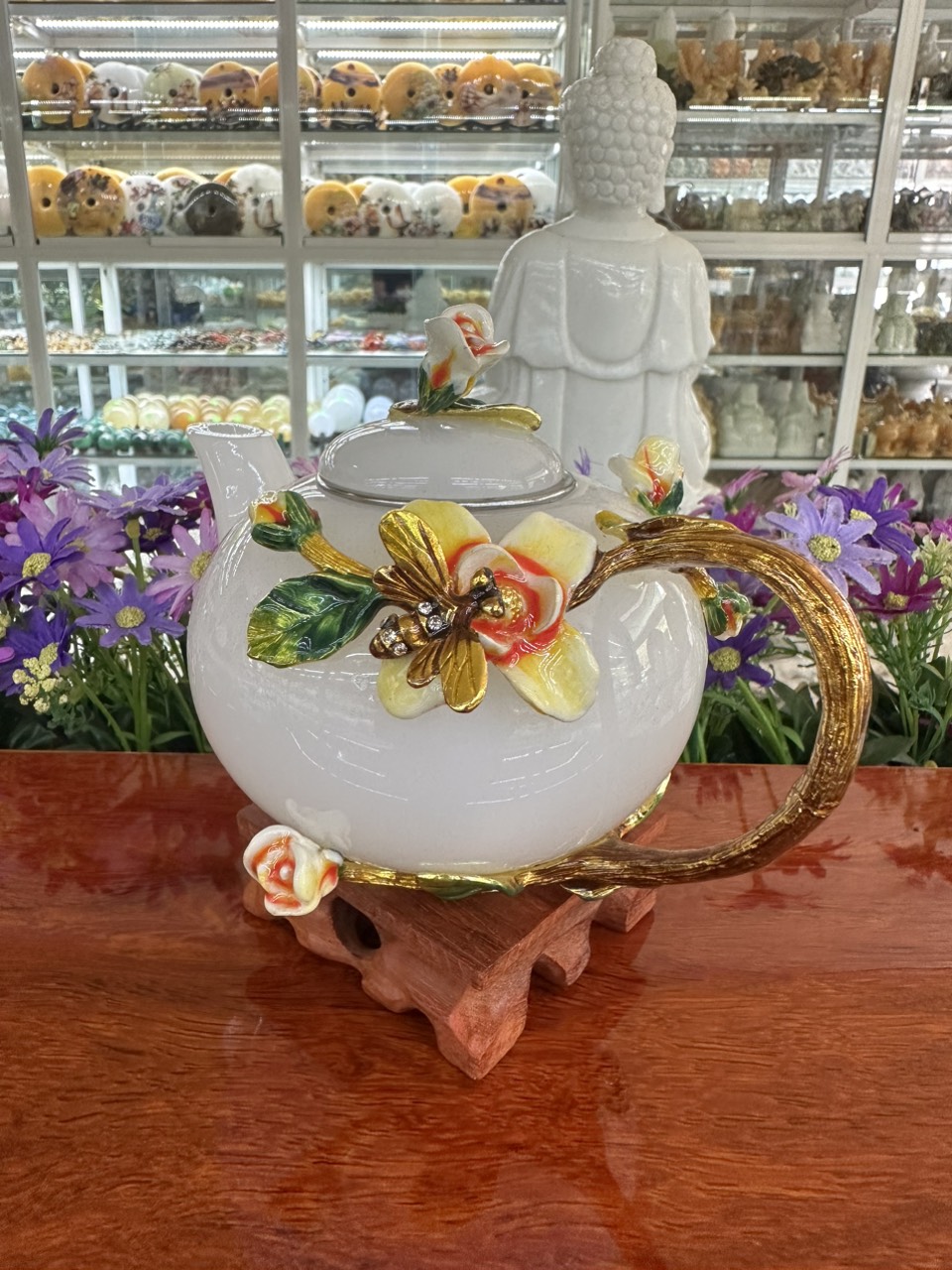 ✨Bộ ấm trà chạm hoa hồng và ong đá bạch ngọc