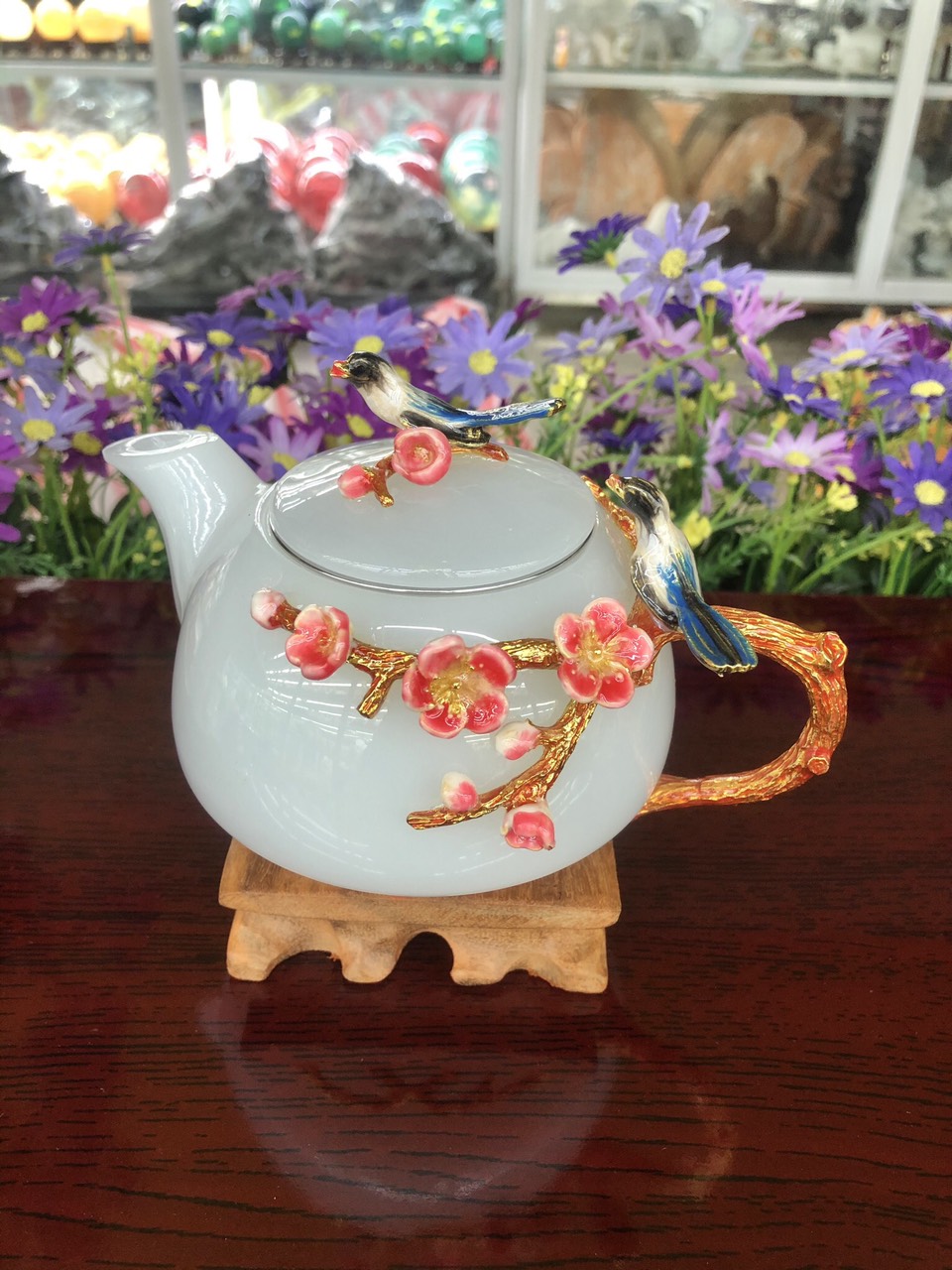 ✨Bộ ấm trà chạm hoa mai và chim với ly chạm chữ đá bạch ngọc