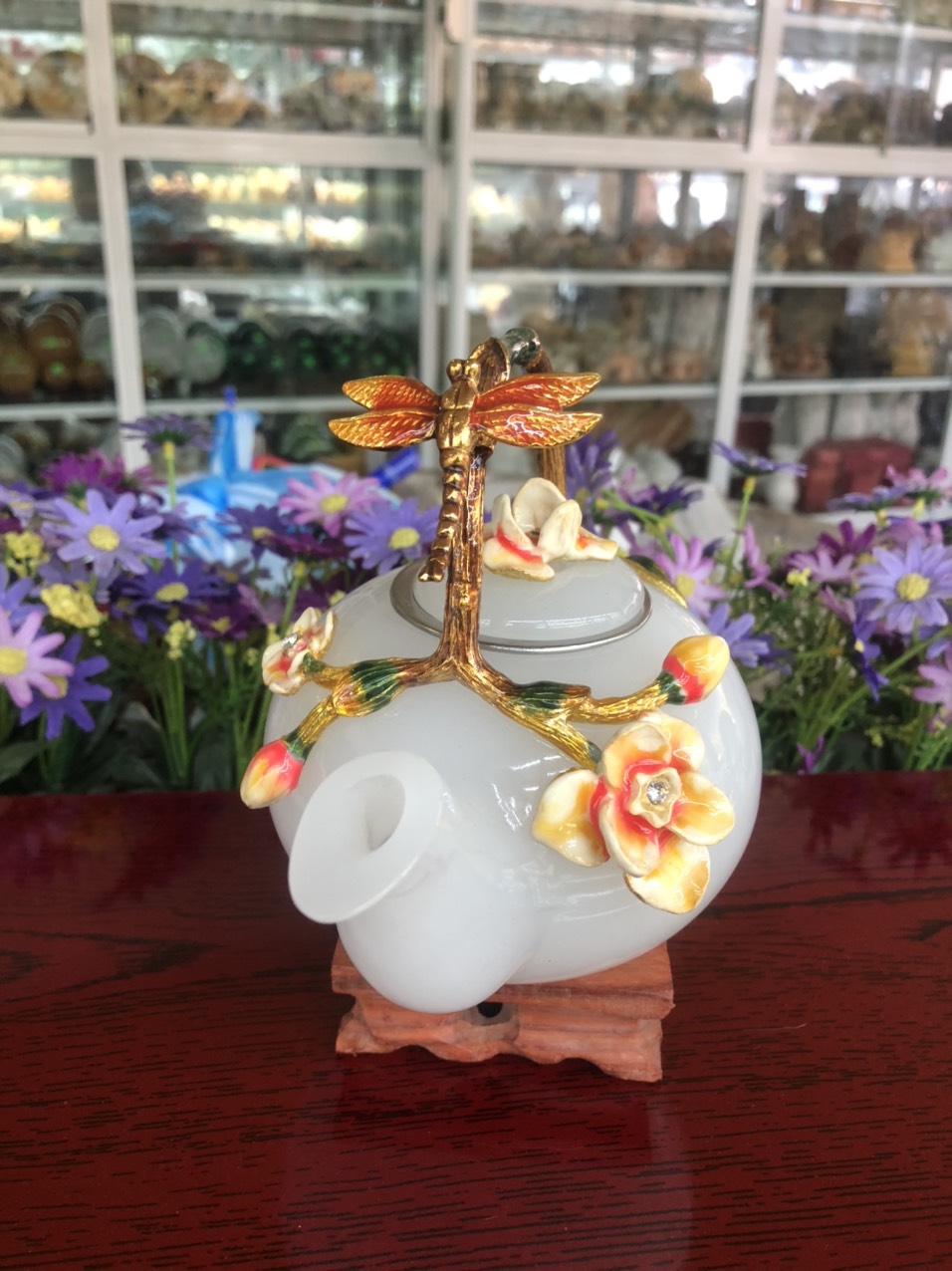 ✨Bộ ấm trà chạm hoa và con chuồn chuồn với quai xách đá bạch ngọc