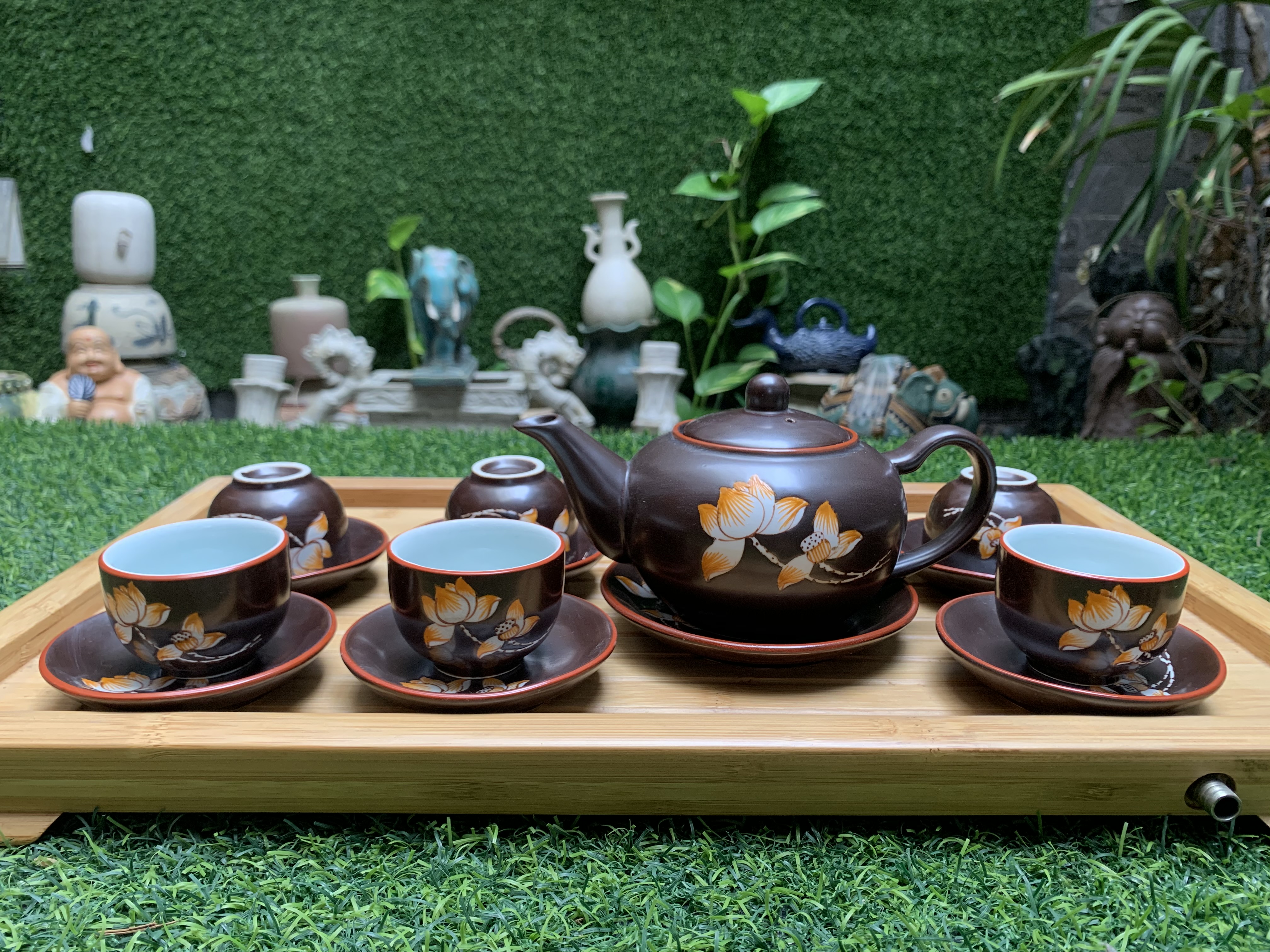 Bộ ấm trà Minh Long hoa Sen men rạn Bát Tràng.