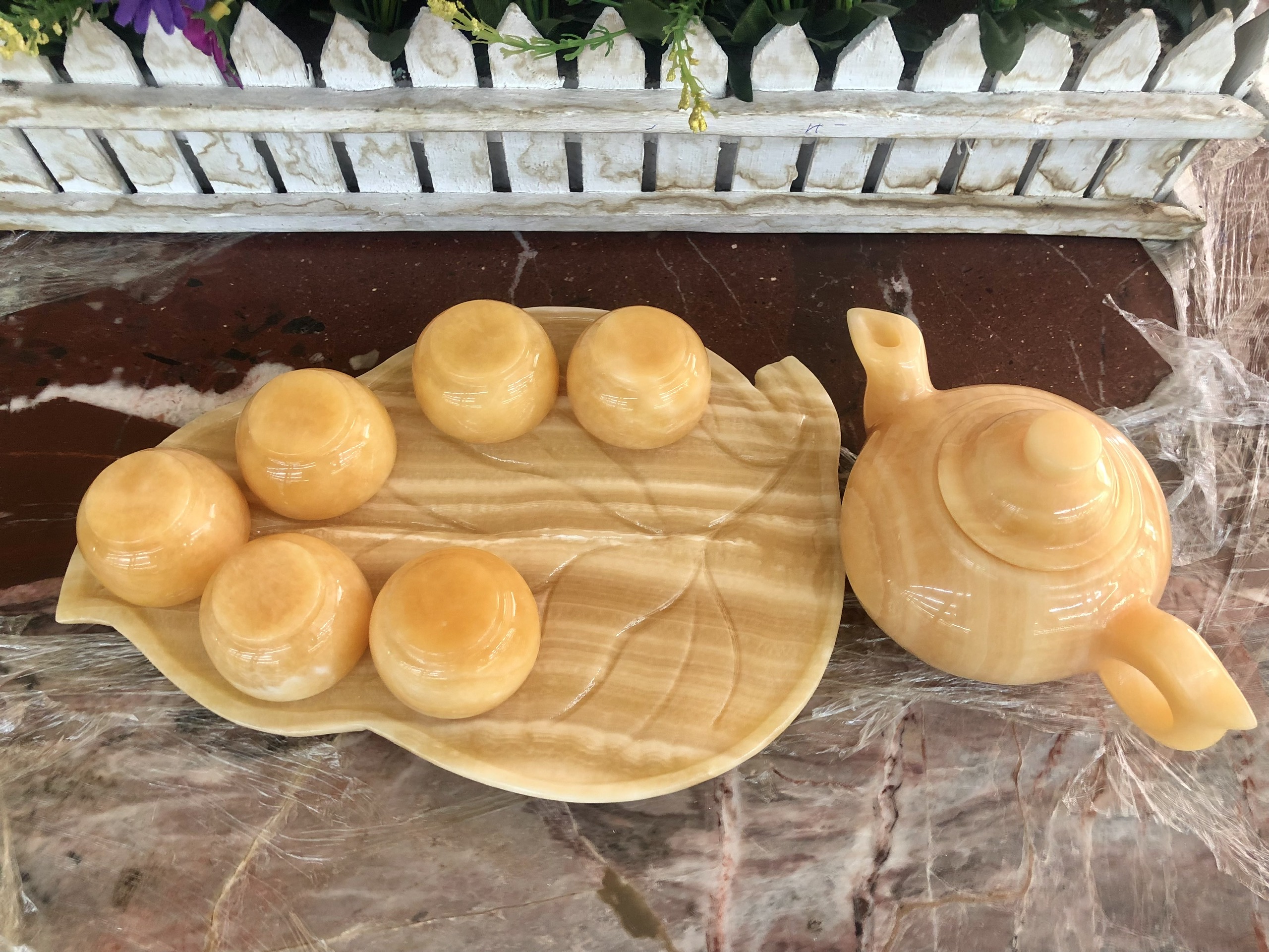 Chất liệu: Đá ngọc Onyx Bộ sản phẩm gồm: 7 dĩa, 6 ly và 1 ấm trà Khối lượng: 1,5 kg Sử dụng làm vật phẩm trang trí nhà cửa, quà biếu hoặc có thể