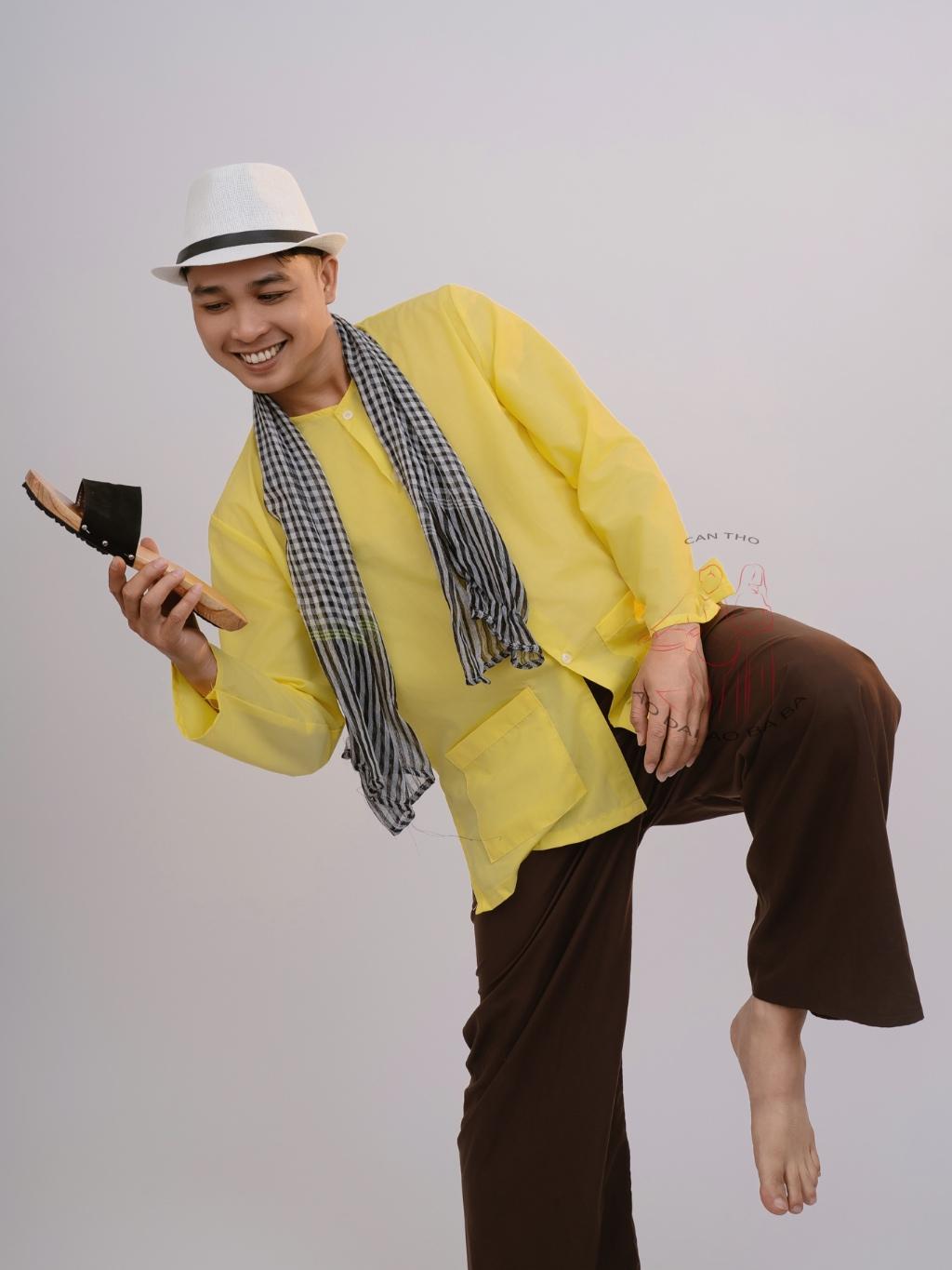 Bộ Bà Ba Nam Áo Vàng và Quần Nâu Vải Kate