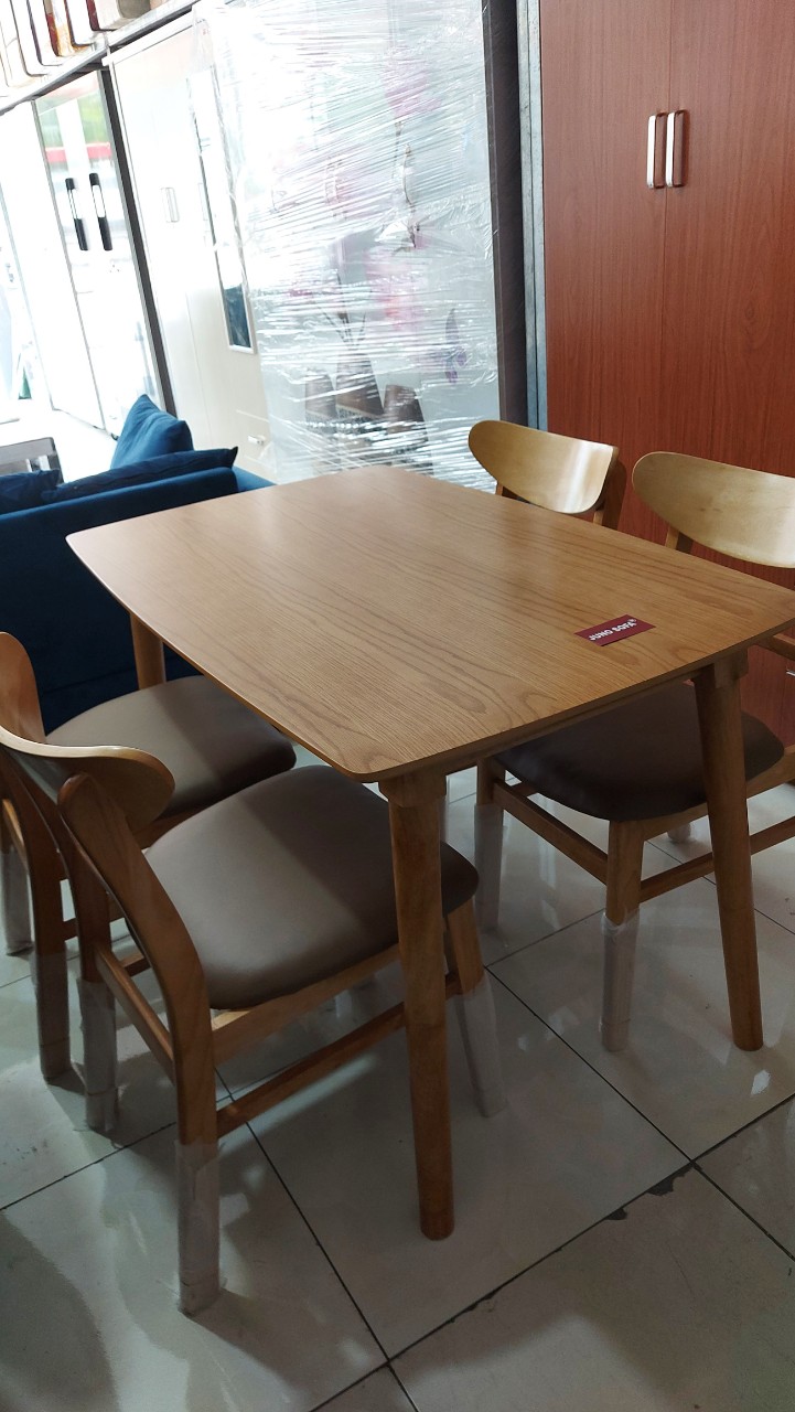 Mô tả sản phẩm - Kích thước bàn 1,2m*75cm, cao 75cm - Kích thước ghế 45*45*80cm - Chất liệu gỗ cao su tự nhiên, chất liệu nệm: simili - Mặt bàn HDF Lỗi xanh -