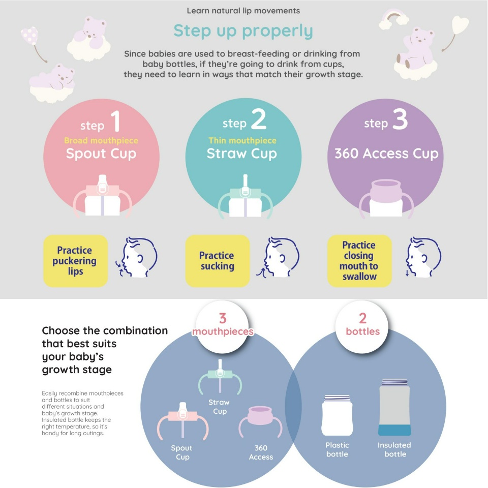 Hướng dẫn sử dụng: Bộ sản phẩm là sự kết hợp đầy đủ 3 bước tập uống cho bé bao gồm 2 thân bình và 3 nắp: tập uống, ống hút, tập uống 360 độ. 3 loại nắp phù hợp với từng giai đoạn tập uống của bé. Có thể tiệt trùng bằng trùng nước sôi và lò vi sóng (trừ bình giữ nhiệt). Sản phẩm không chứa BPA.
