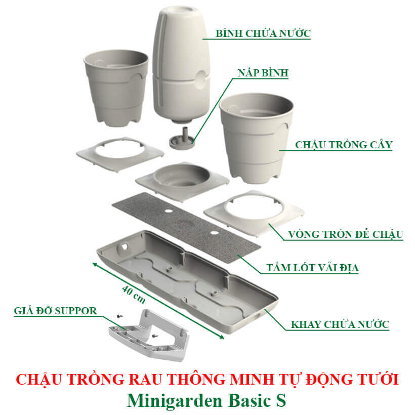 1. CHỨC NĂNG CHẬU TRỒNG CÂY TỰ DƯỠNG BASIC S: - Nhập khẩu: Minigarden Bồ Đào Nha - Chậu trồng cây tự dưỡng Basic S tự động tưới và tự cân bằng độ ẩm cho