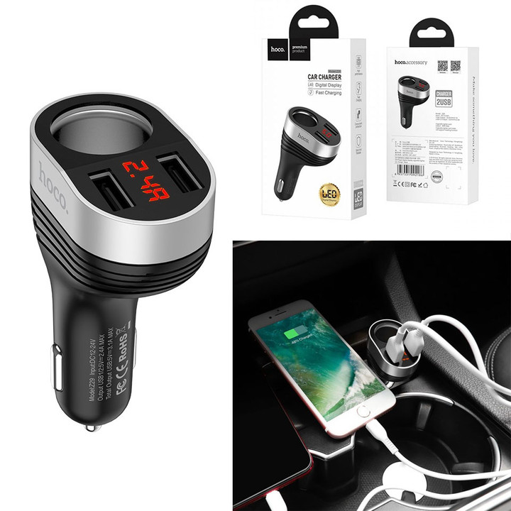 ✨Bộ chia tẩu sạc dùng cho ô tô, xe hơi nhãn hiệu Hoco Z29, Đầu vào: DC12 - 24V, Đầu ra: USB1/2DC5V/2.4A,ổng đầu ra 2 cổng USB: DV5V/3.1A Max , Đầu ra 2 lỗ tẩu sạc: 96W Max , Hàng nhập khẩu