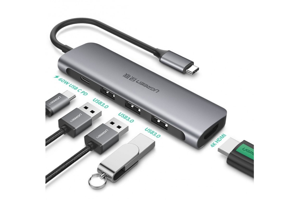 - Sản phẩm chính hãng Ugreen - Bộ chuyển đổi 6 trong 1 tiện dụng - Chuyển đổi tín hiệu USB-C sang HDMI - 3 cổng USB-A 3.0 - Hỗ trợ xuất hình ảnh độ