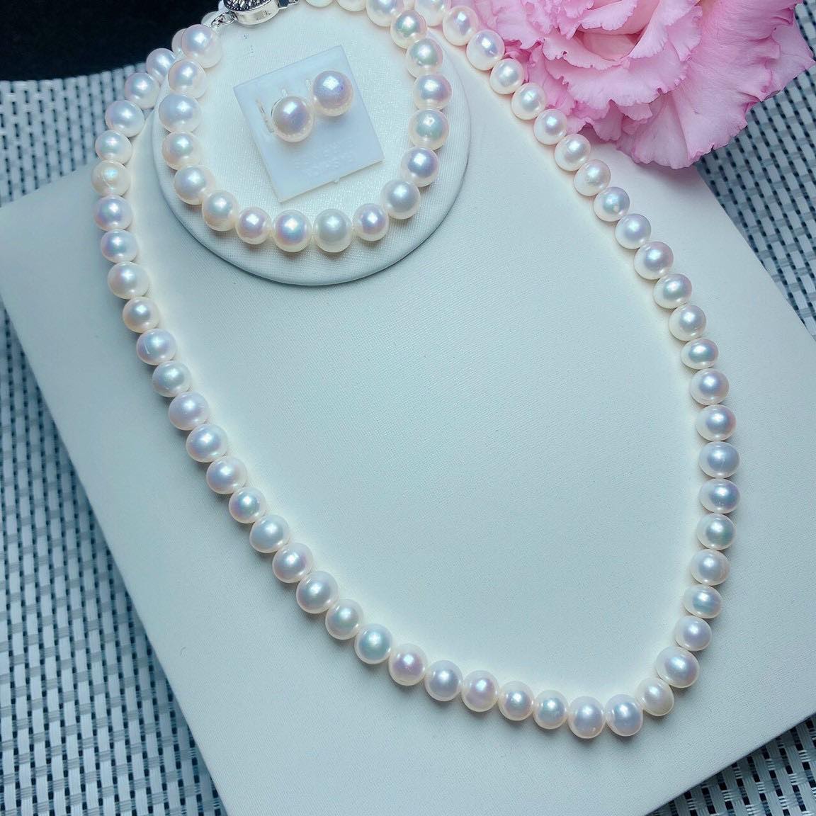 Chất liệu: Ngọc trai nuôi Kích thước: Hạt 8 - 9 mm Bao gồm: Dây chuyền đeo cổ, vòng đeo tay và bông tai Sang trọng để làm quà tặng người phụ nữ yêu quý