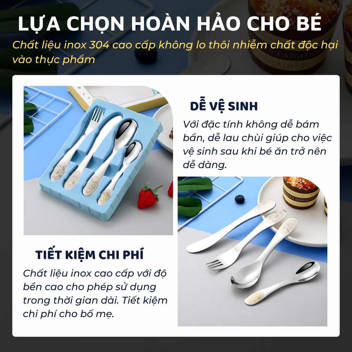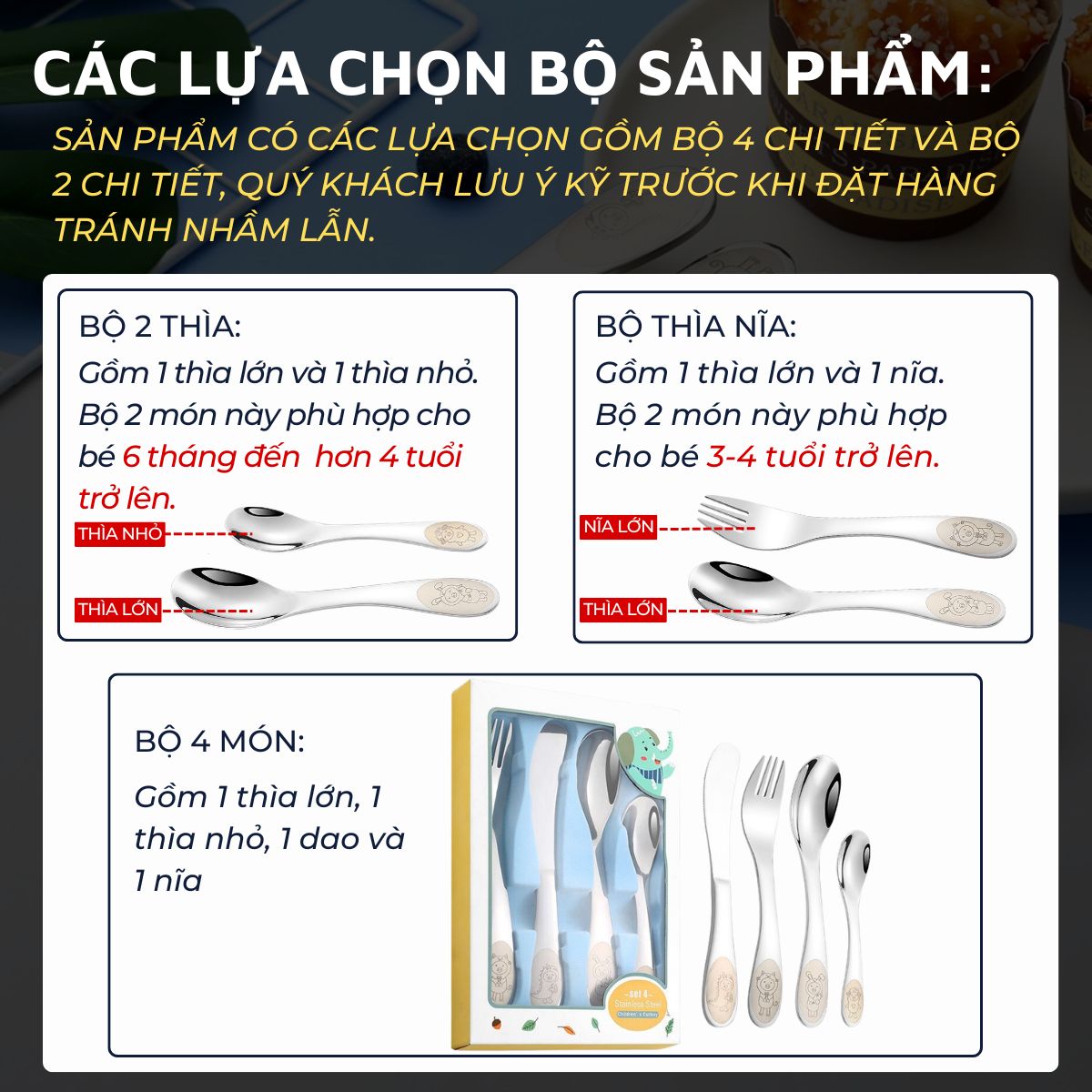 • Set 4 sản phẩm: 2 thìa + 1 nĩa + 1 dao