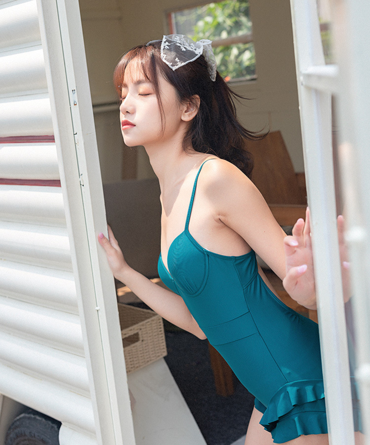 - Đơn giản nhưng vẫn cực kì nổi bật nhờ đường cong ôm sát, cách điệu với lớp bèo vừa che vai, vừa tôn vòng một các nàng ạ. - Bikini mặc đi biển làm