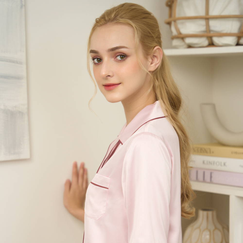 Bộ satin dài, form thoải mái sang trọng, viền mí nổi bật