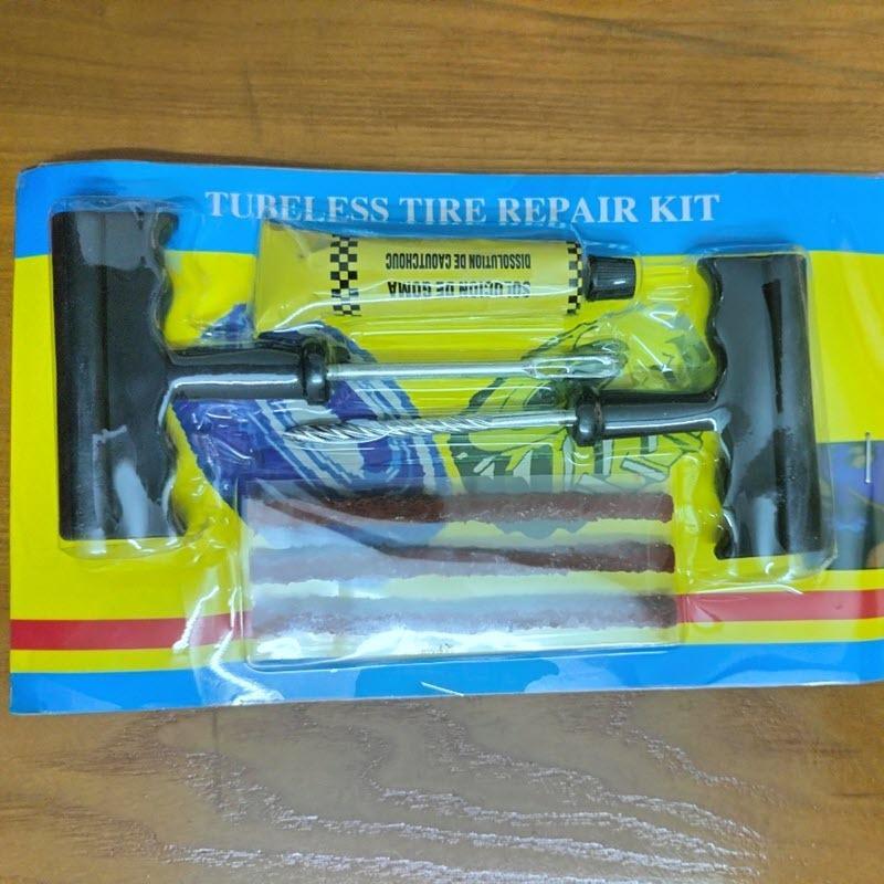 Bộ sản phẩm Dụng Cụ Vá Lốp Không Săm gồm : 1 cây dùi, 1 cây gim, 1 chai keo 12ml và 3 sợi cao su non.