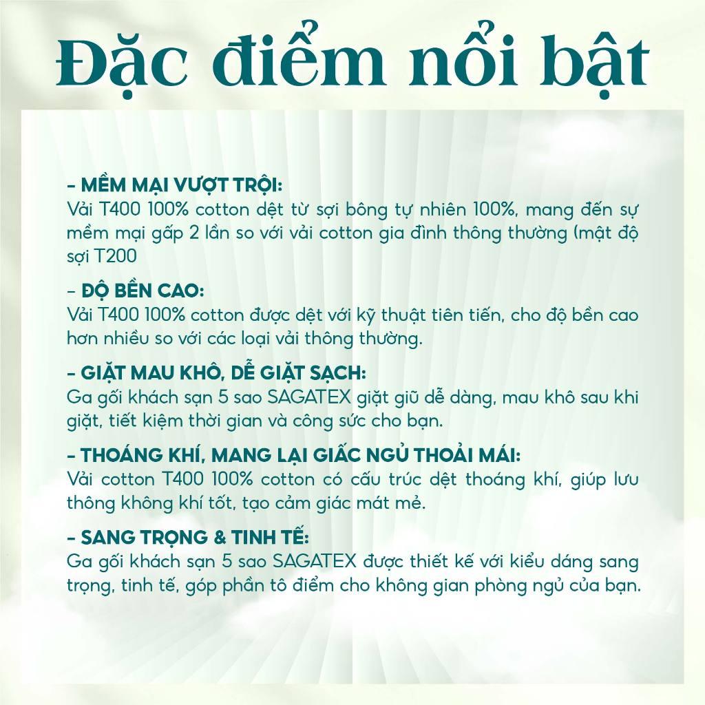 - 01 GA GỐI với mật độ sợi T400 hoặc T500, GA GỐI Sagatex mềm mại và ấm áp hơn gấp đôi so với cotton thông thường, giúp bạn cảm nhận cảm giác êm dịu và thoải mái khi nằm trong giấc ngủ. -Thương hiệu: SAGATEX